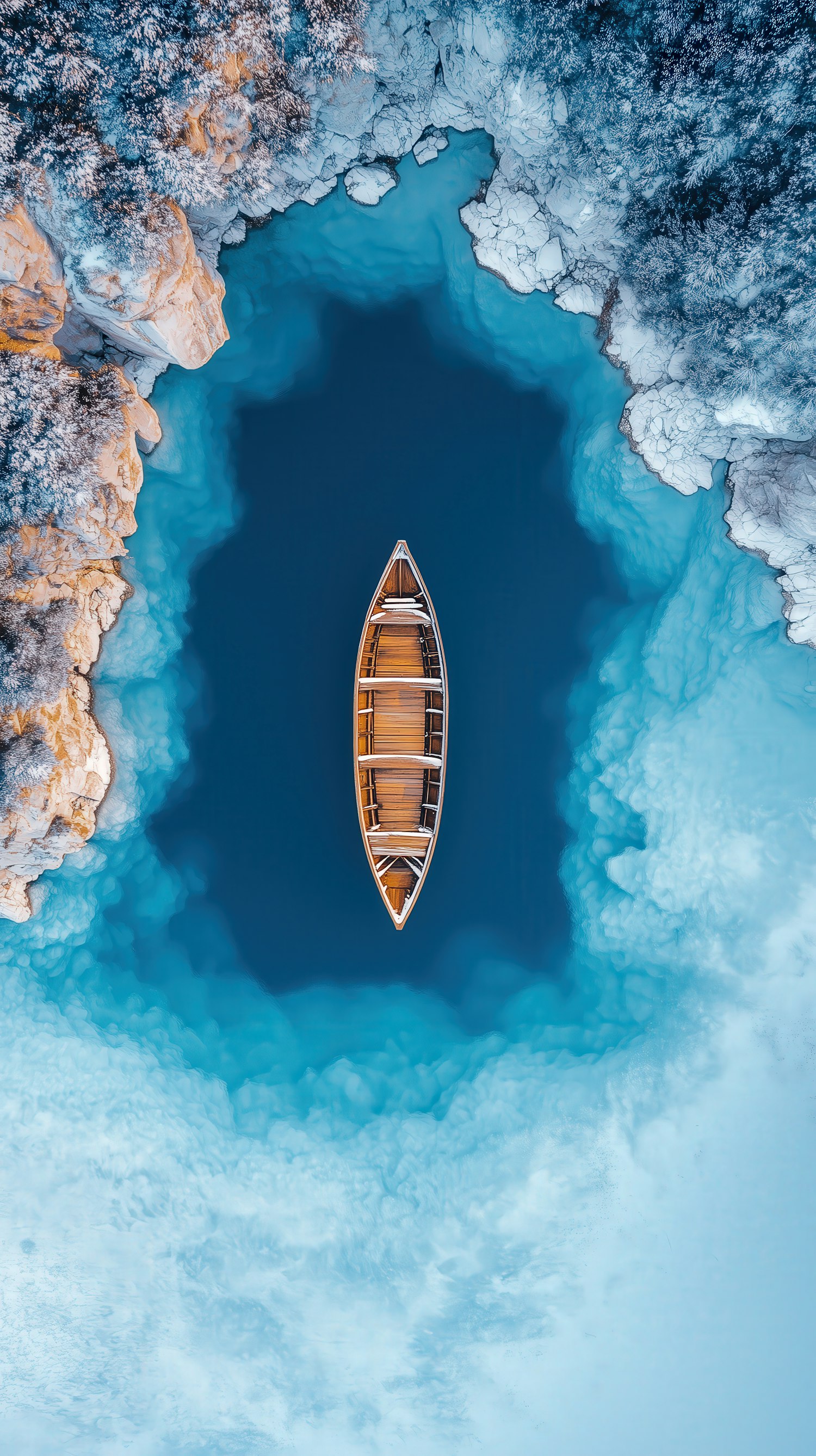 A wooden canoe floats on a calm, icy blue lake surrounded by snow-covered rocks and frosted trees, creating a serene winter scene.