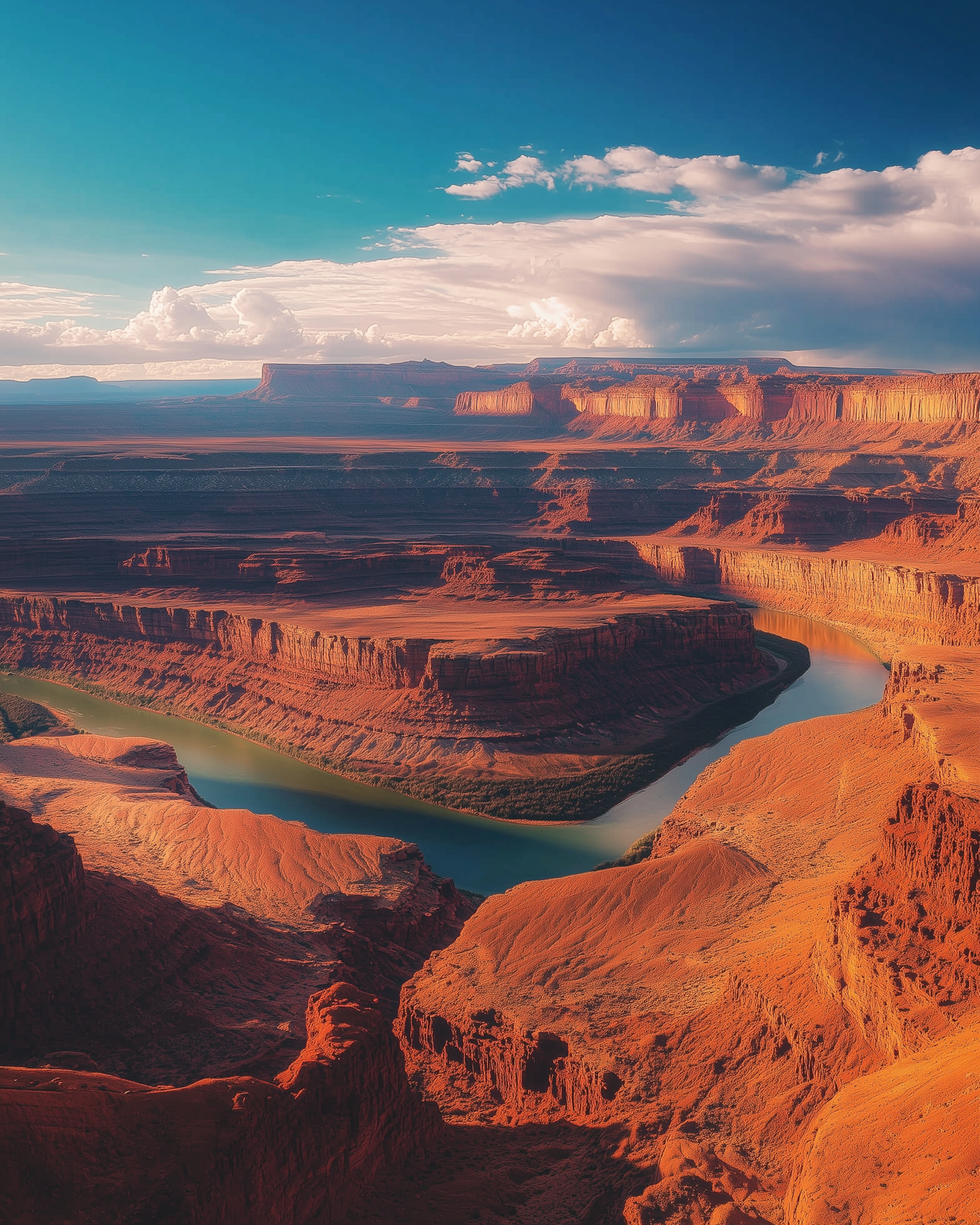 Stunning canyon landscape with a winding river, red rock formations, and a vibrant blue sky with scattered clouds.