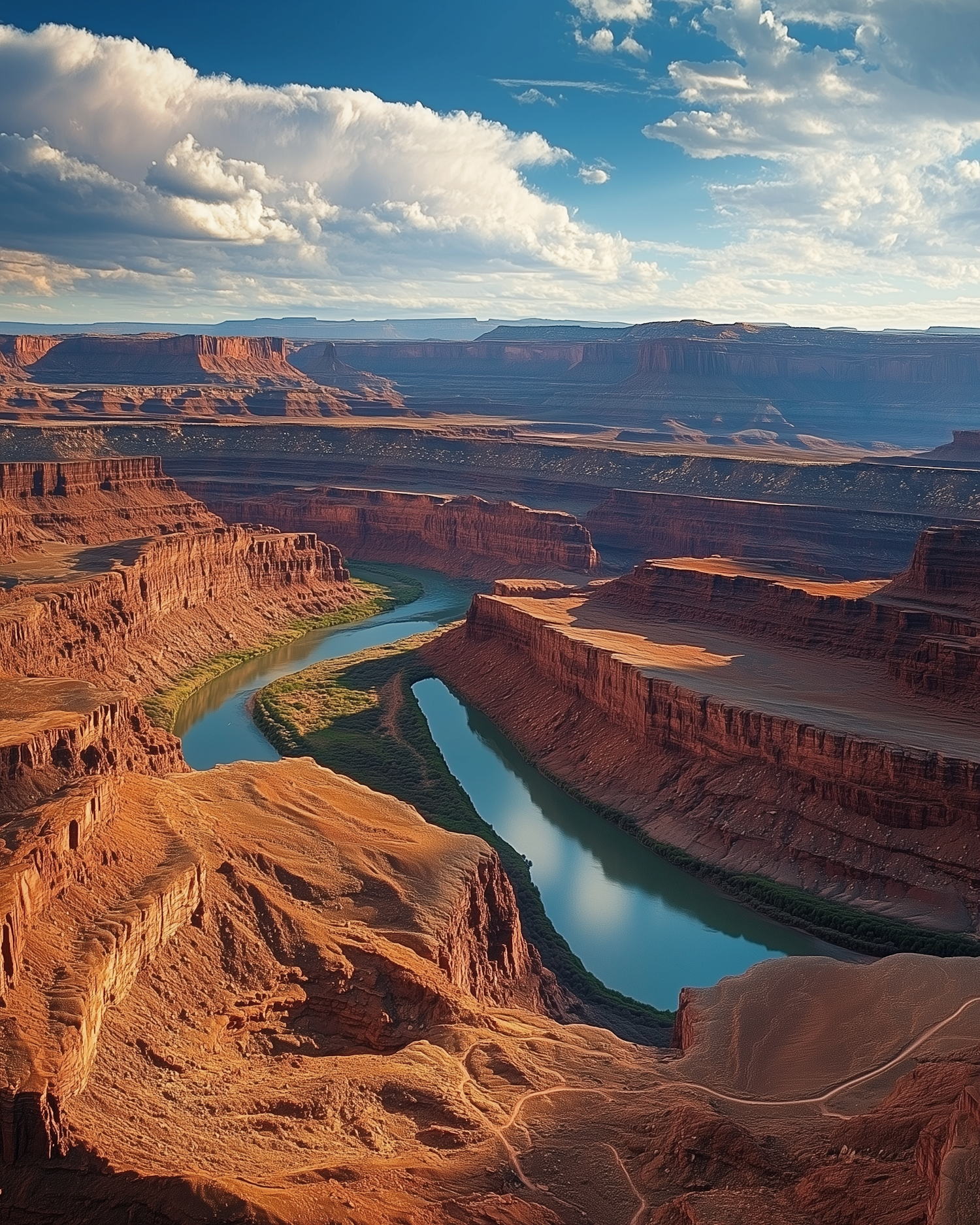 Majestic canyon with a winding river, red rock formations, and a vibrant blue sky with clouds. A stunning natural landscape.