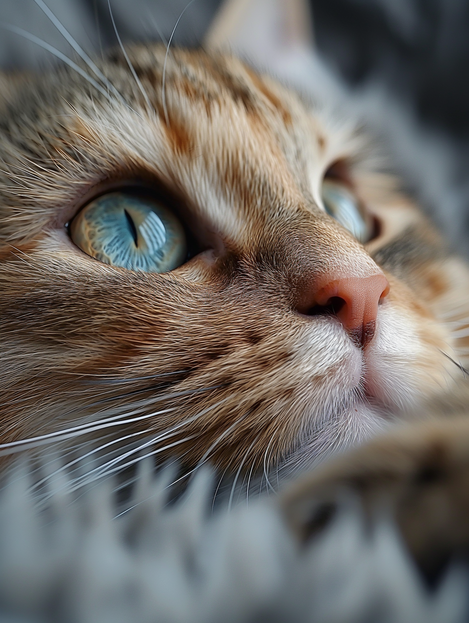 Close-up of a cat's face with striking blue eyes and soft fur, highlighting its curious and serene expression.