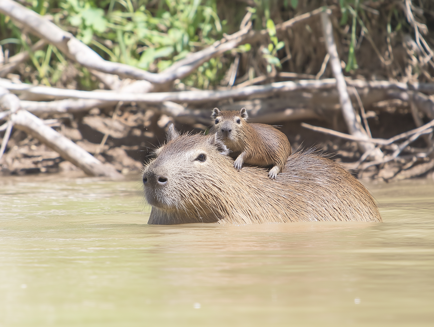 A baby capybara rides on its parent's back in a calm river, surrounded by branches and greenery. A heartwarming wildlife moment.