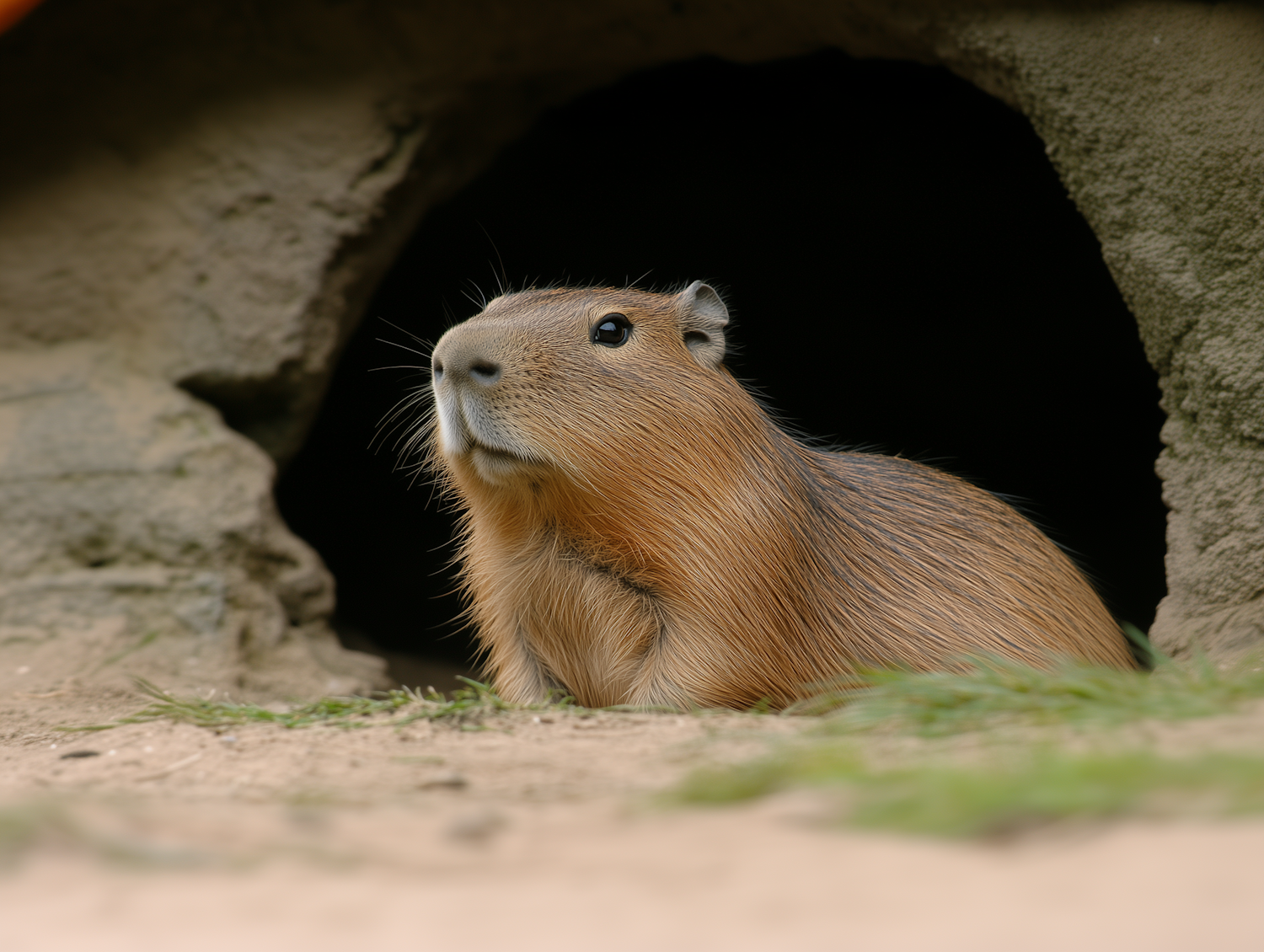 A curious capybara peeks out from its burrow, surrounded by earthy tones and a touch of green grass. Perfect for nature lovers!