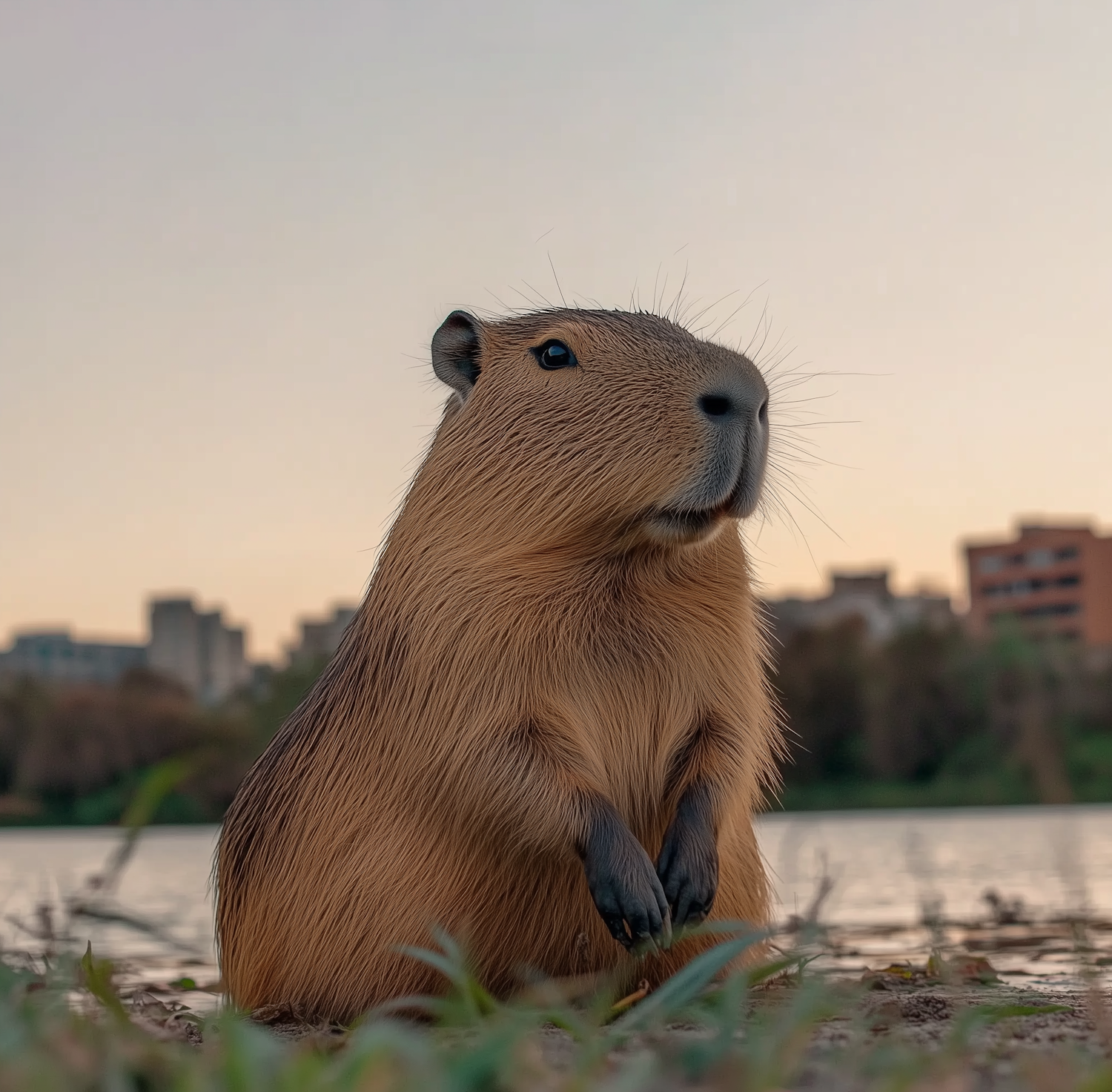 Adorable capybara sitting by a lake at sunset, with a cityscape in the background. Perfect mix of nature and urban vibes!