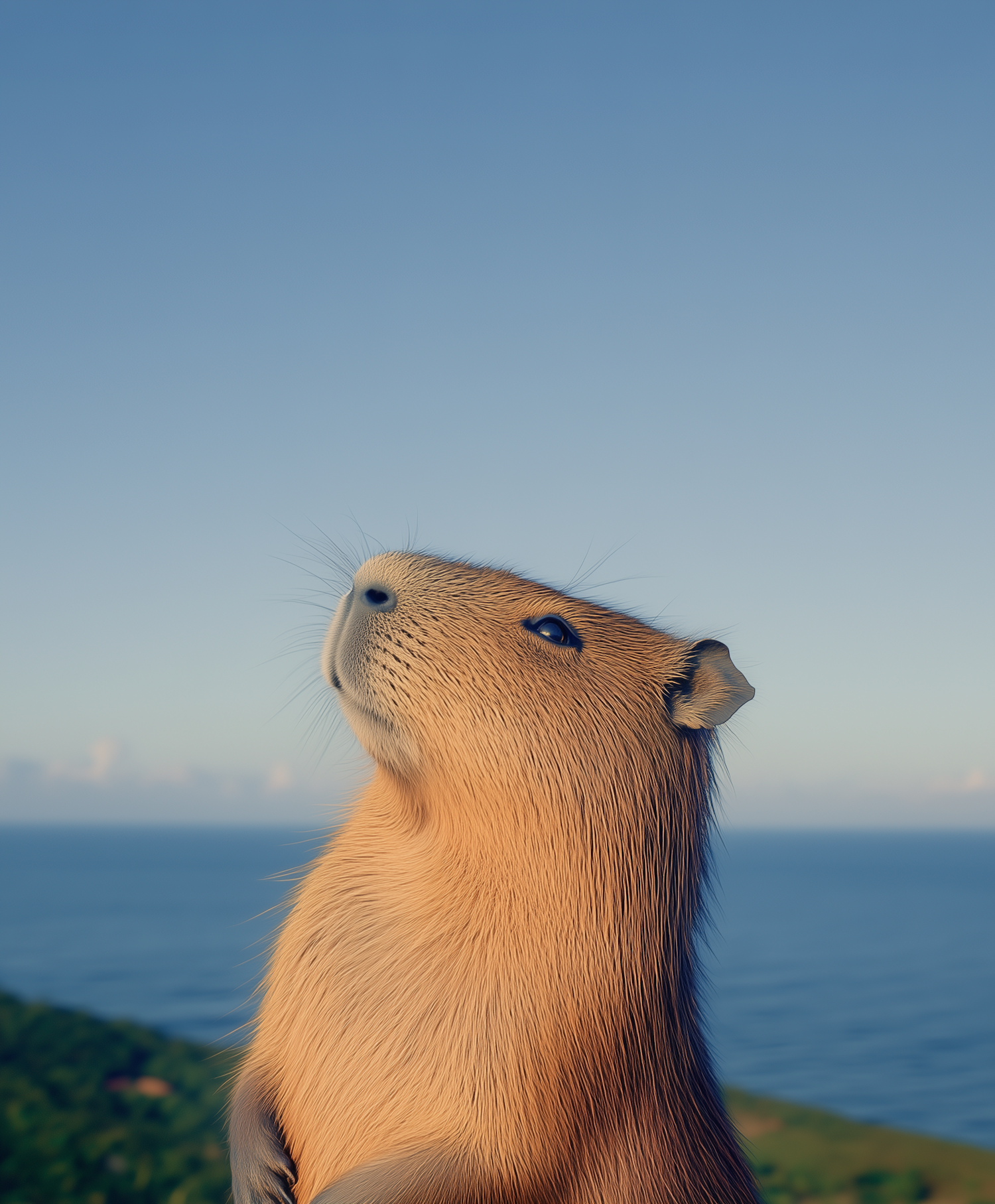 A serene capybara gazing upward with a scenic ocean and hill backdrop under a clear blue sky.