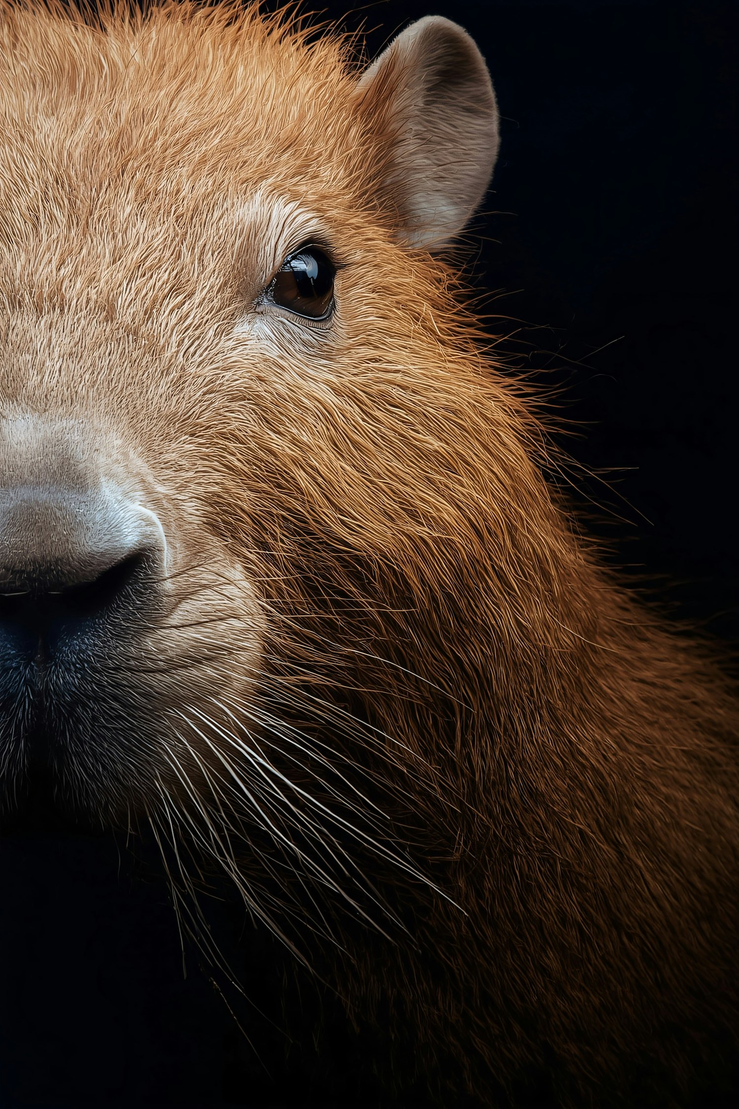 Close-up of a capybara's face with detailed fur and whiskers against a black background, highlighting its gentle expression.