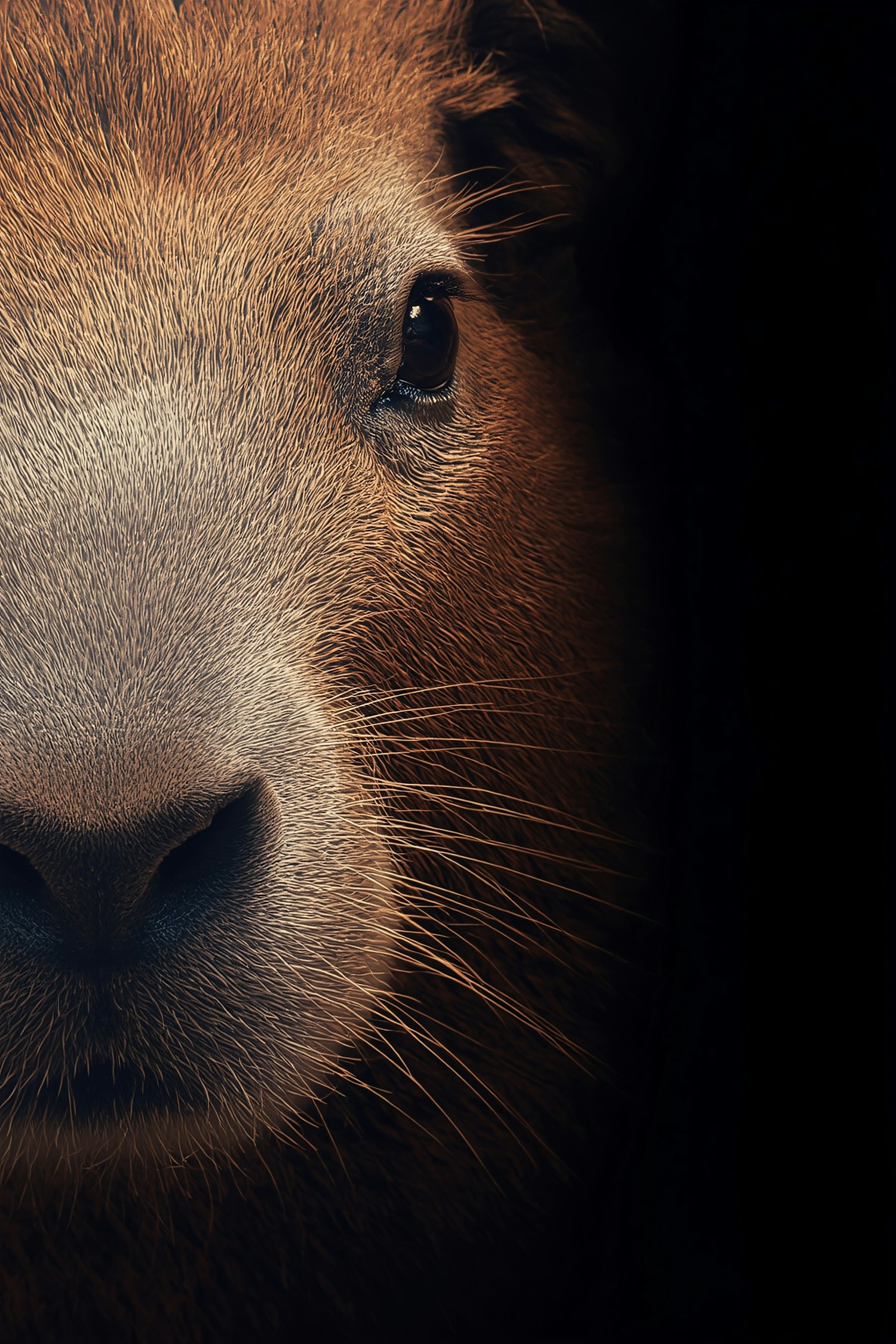 Close-up of a capybara's face, showcasing its detailed fur texture and expressive eye against a dark background.