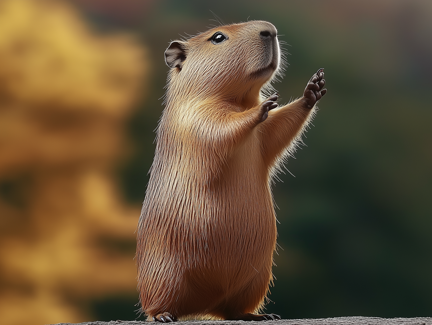 Adorable capybara standing upright with paws raised, set against a blurred natural background of warm yellow and green tones.