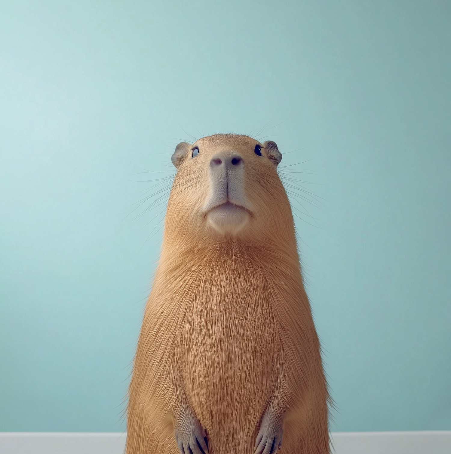 A cute digital rendering of a capybara standing upright against a light blue background, showcasing its golden-brown fur and calm expression.
