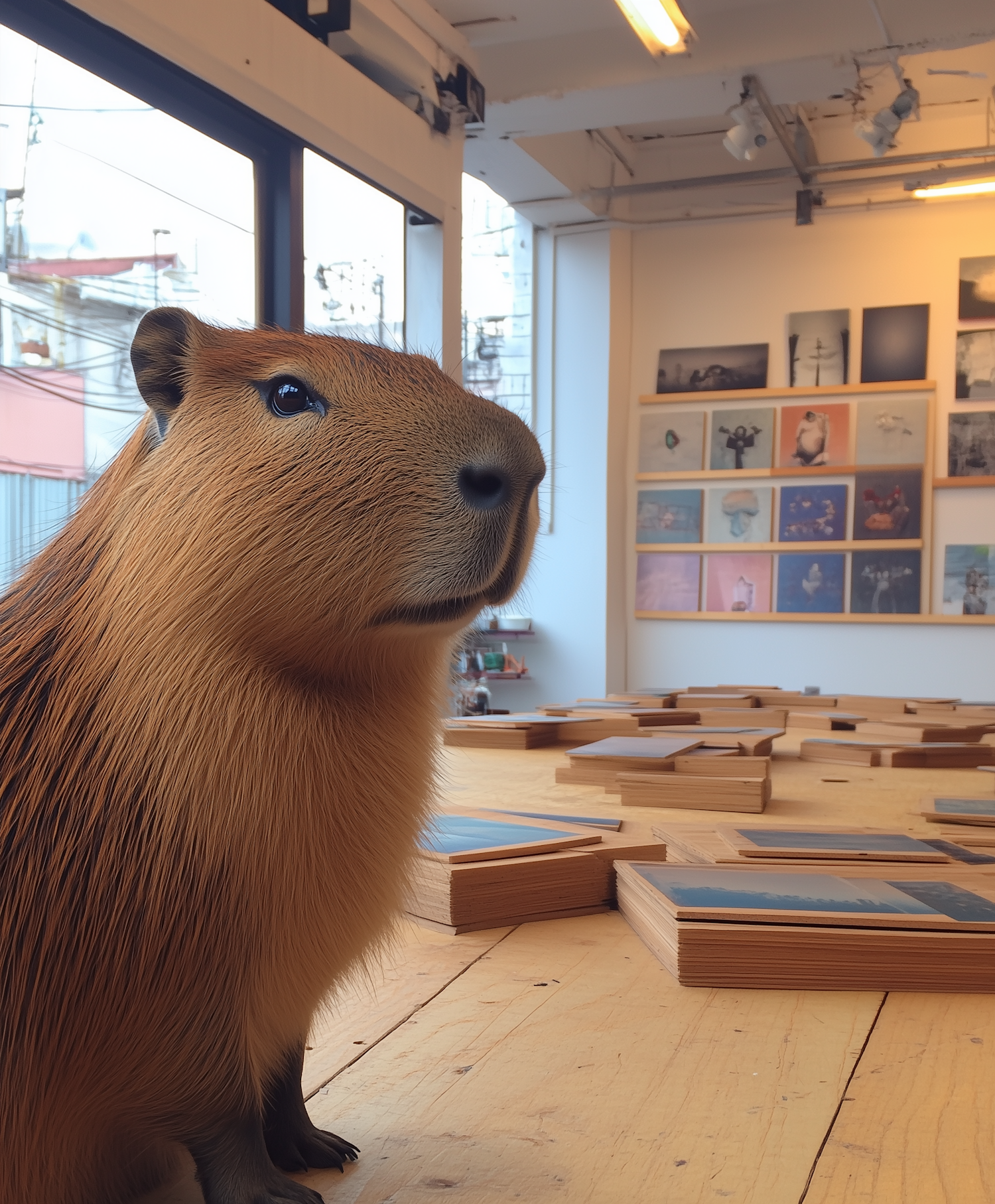 A curious capybara in an art gallery surrounded by framed artwork and natural light streaming through large windows.