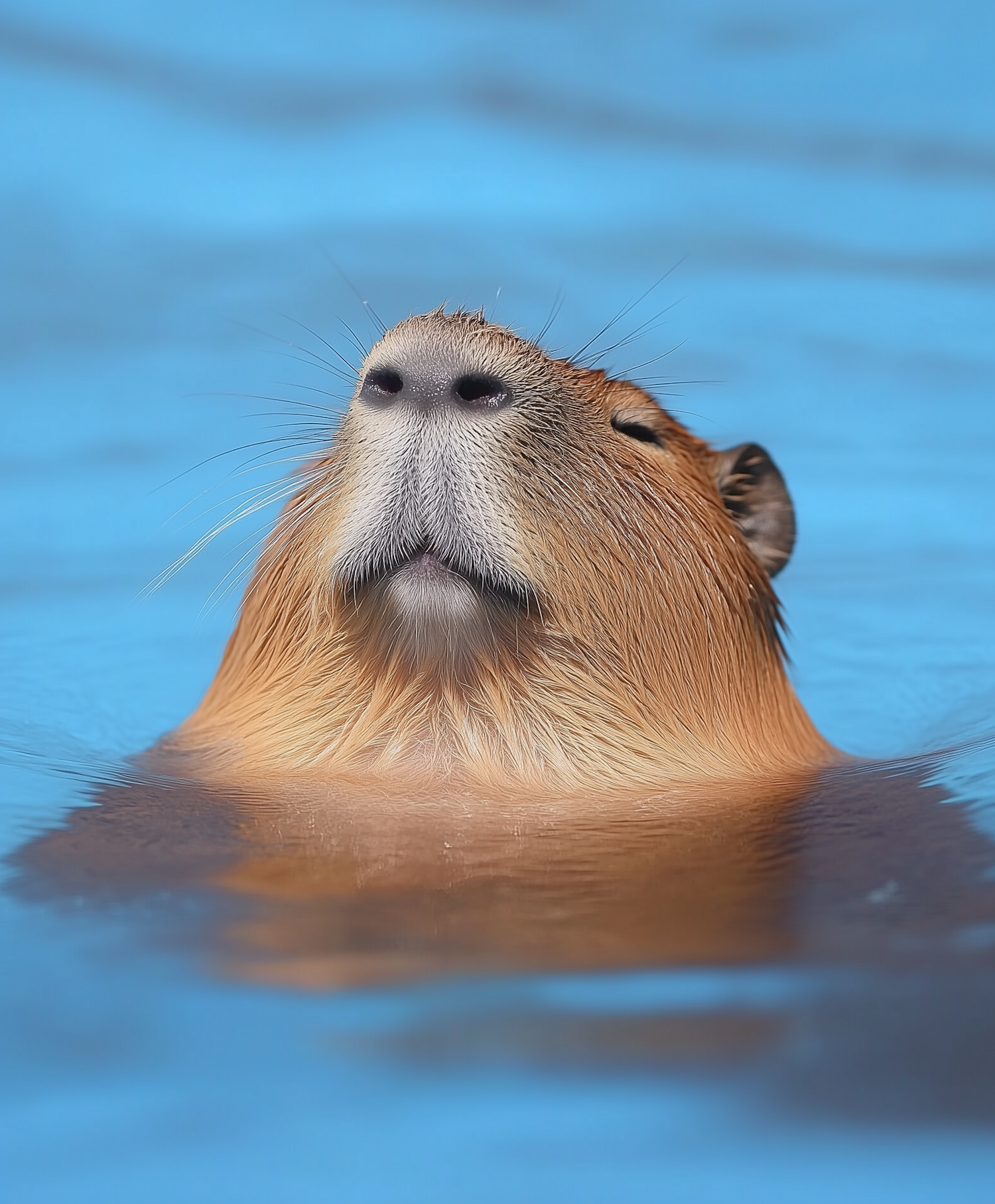 A serene capybara enjoying a swim, its head peeking above calm blue water, showcasing its wet fur and relaxed demeanor.