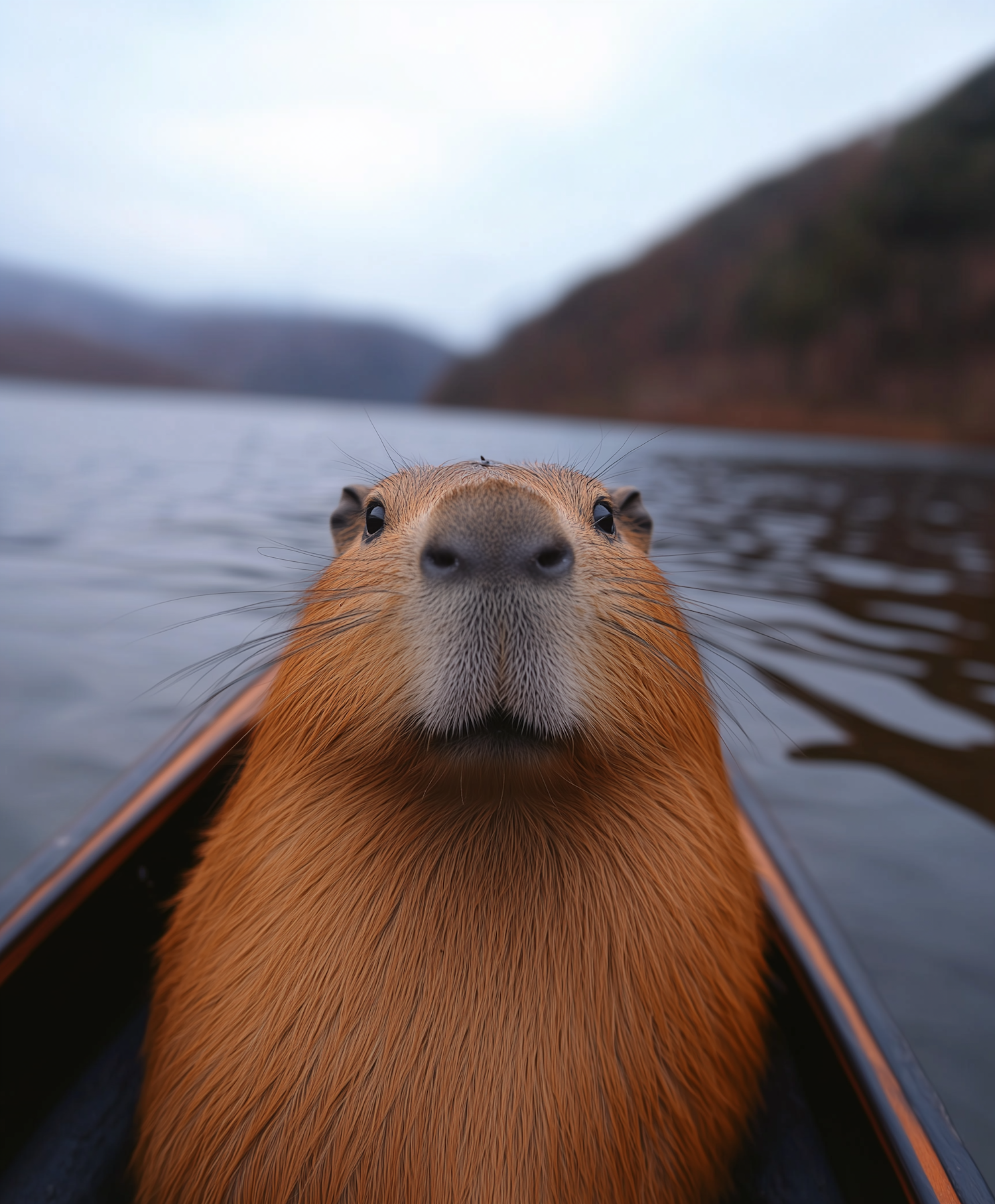 Adorable capybara close-up in a canoe on a tranquil lake, surrounded by misty hills and calm waters. Perfect mix of nature and cuteness!