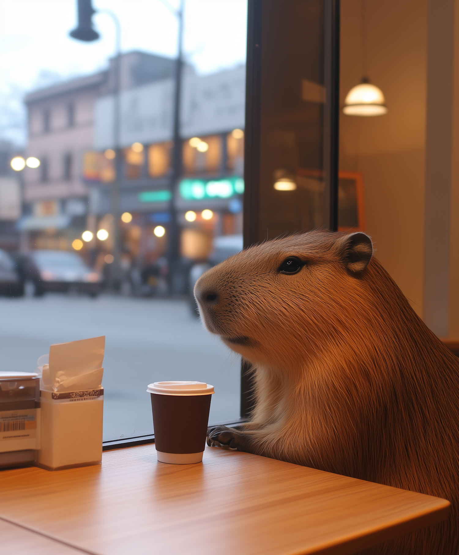 A capybara sits at a café table with a coffee cup, gazing out the window at a bustling city street. Cozy and whimsical vibes.