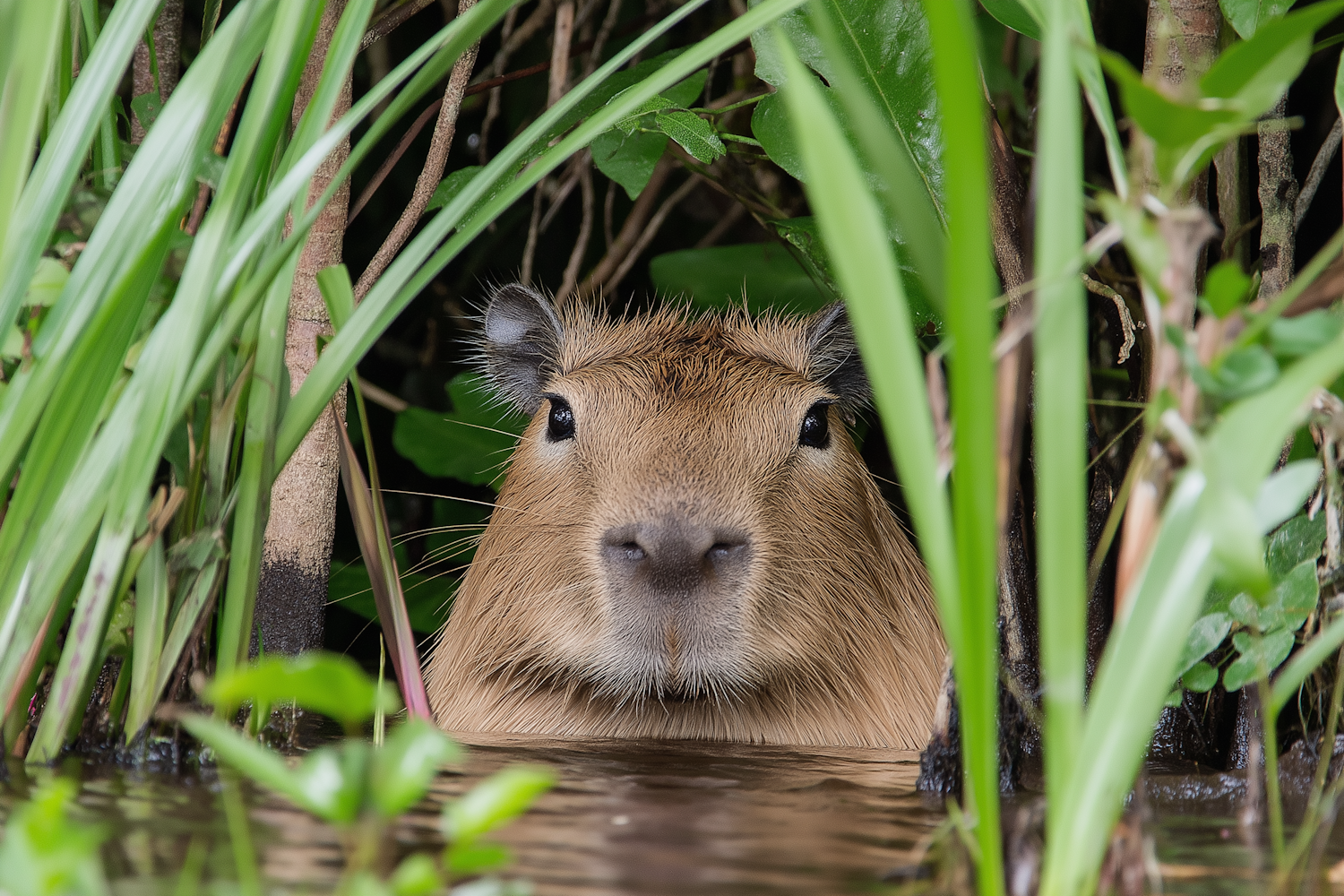 A curious capybara peeks through lush green foliage, partially submerged in water, creating a serene and natural wildlife moment.