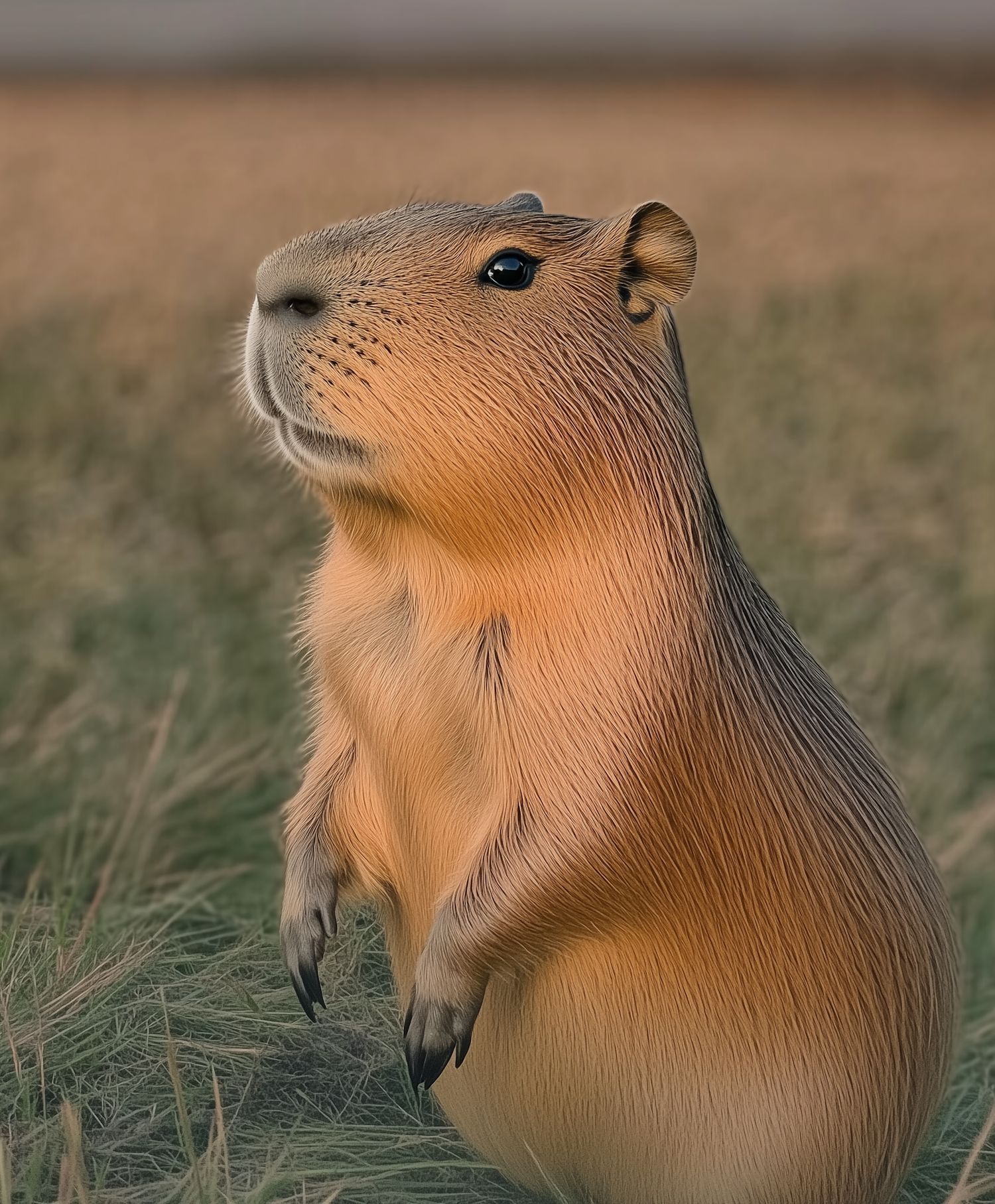 A curious capybara standing upright in a grassy field, showcasing its golden-brown fur and expressive black eyes.