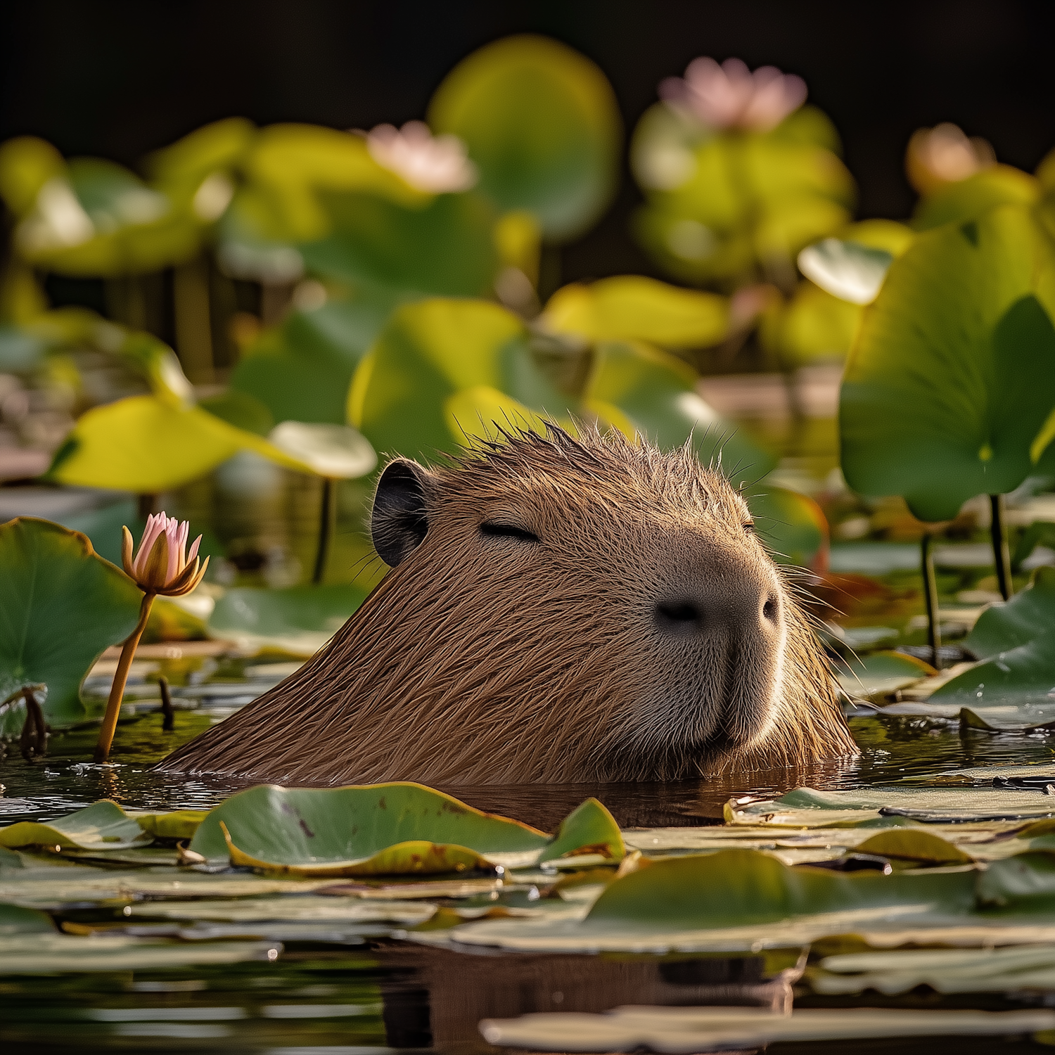 A relaxed capybara in a pond surrounded by lily pads and lotus flowers, basking in the sunlight with a serene expression.