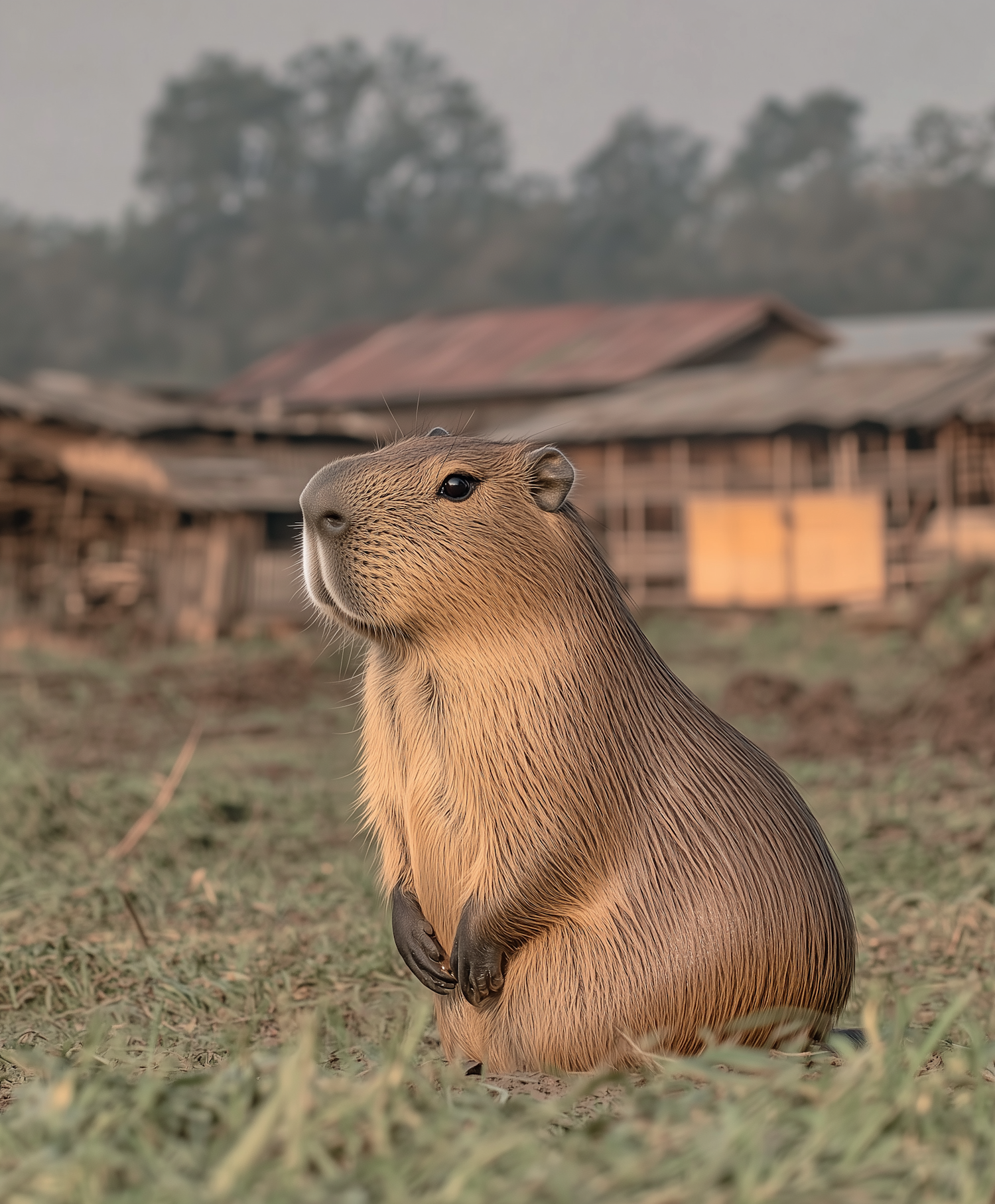 A curious capybara standing upright in a grassy field with rustic wooden buildings and a hazy forest in the background.