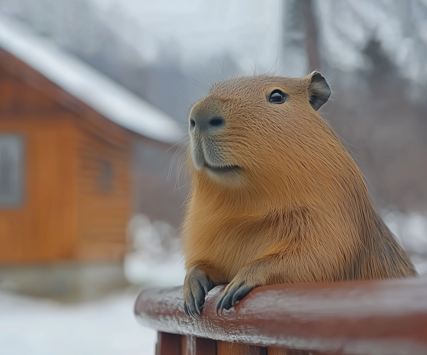 A serene capybara rests on a wooden railing in a snowy setting, with a cozy cabin in the background. Perfect winter wildlife moment.