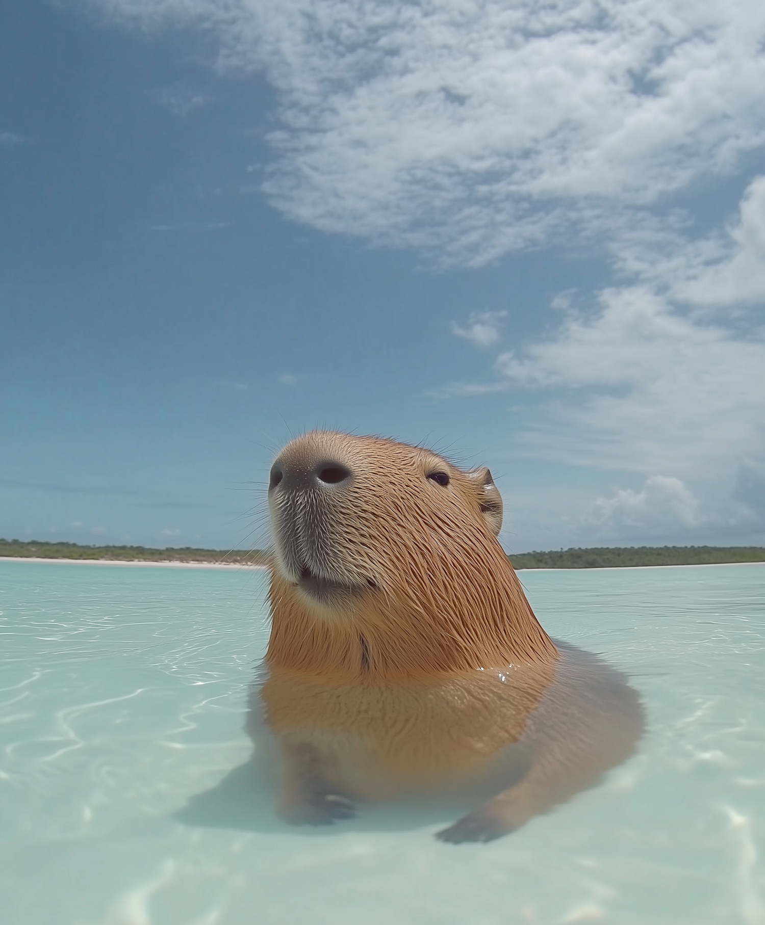 A serene capybara enjoying a swim in clear turquoise water under a bright blue sky with fluffy clouds. Perfect summer vibes!