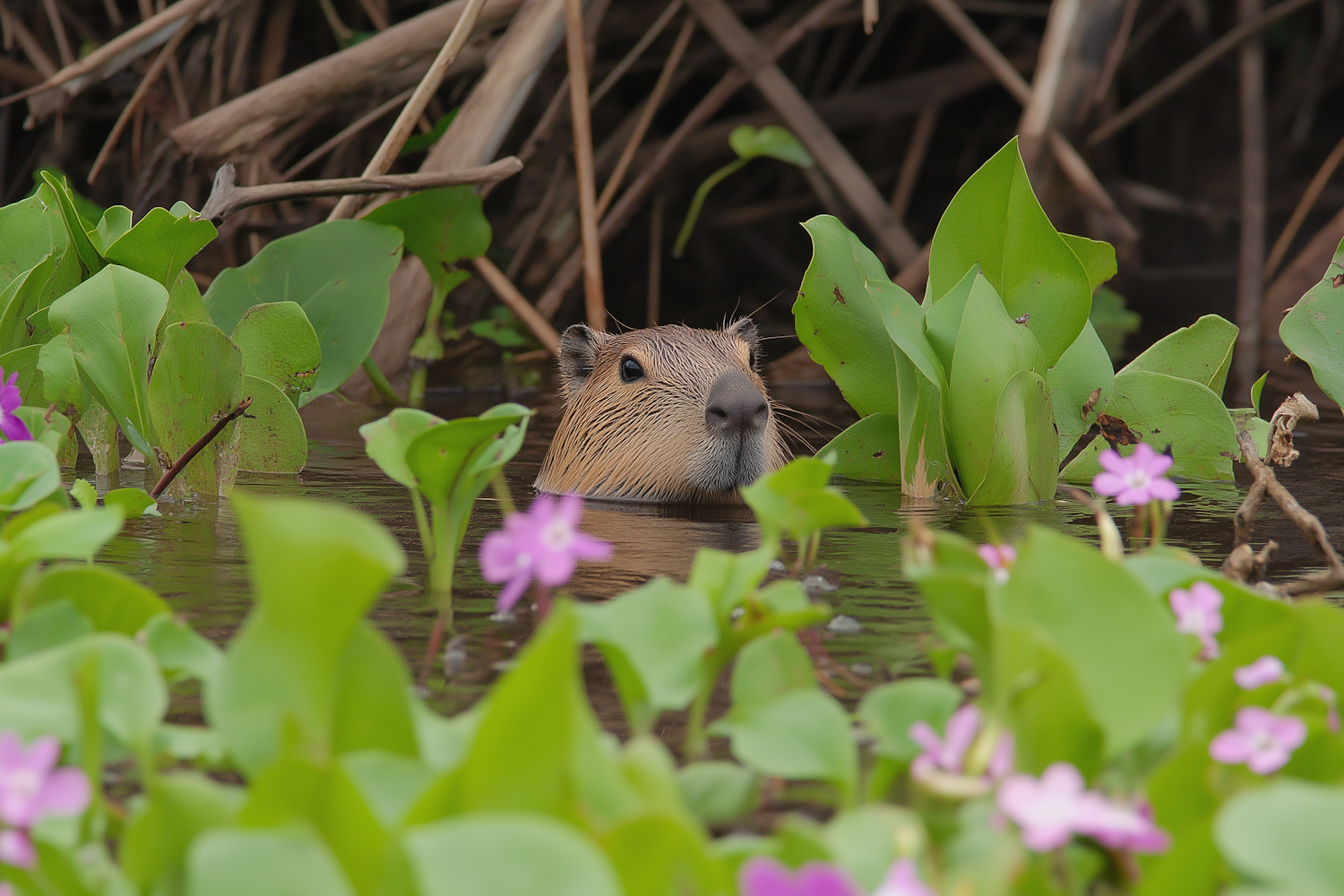 A curious capybara peeks out of the water, surrounded by lush green plants and vibrant pink flowers in a serene natural setting.