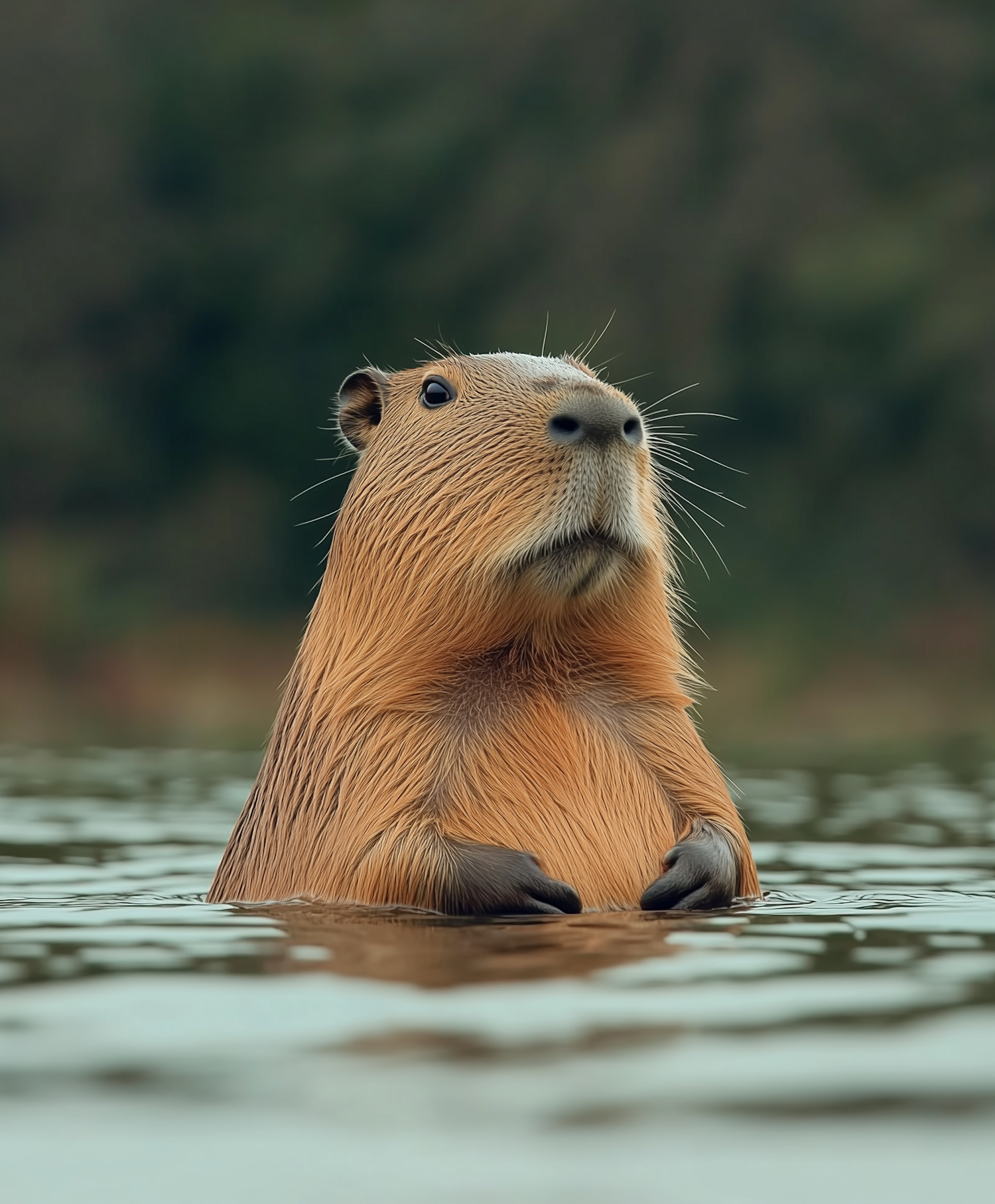 A serene capybara partially submerged in water, with its light brown fur and calm expression against a blurred green background.