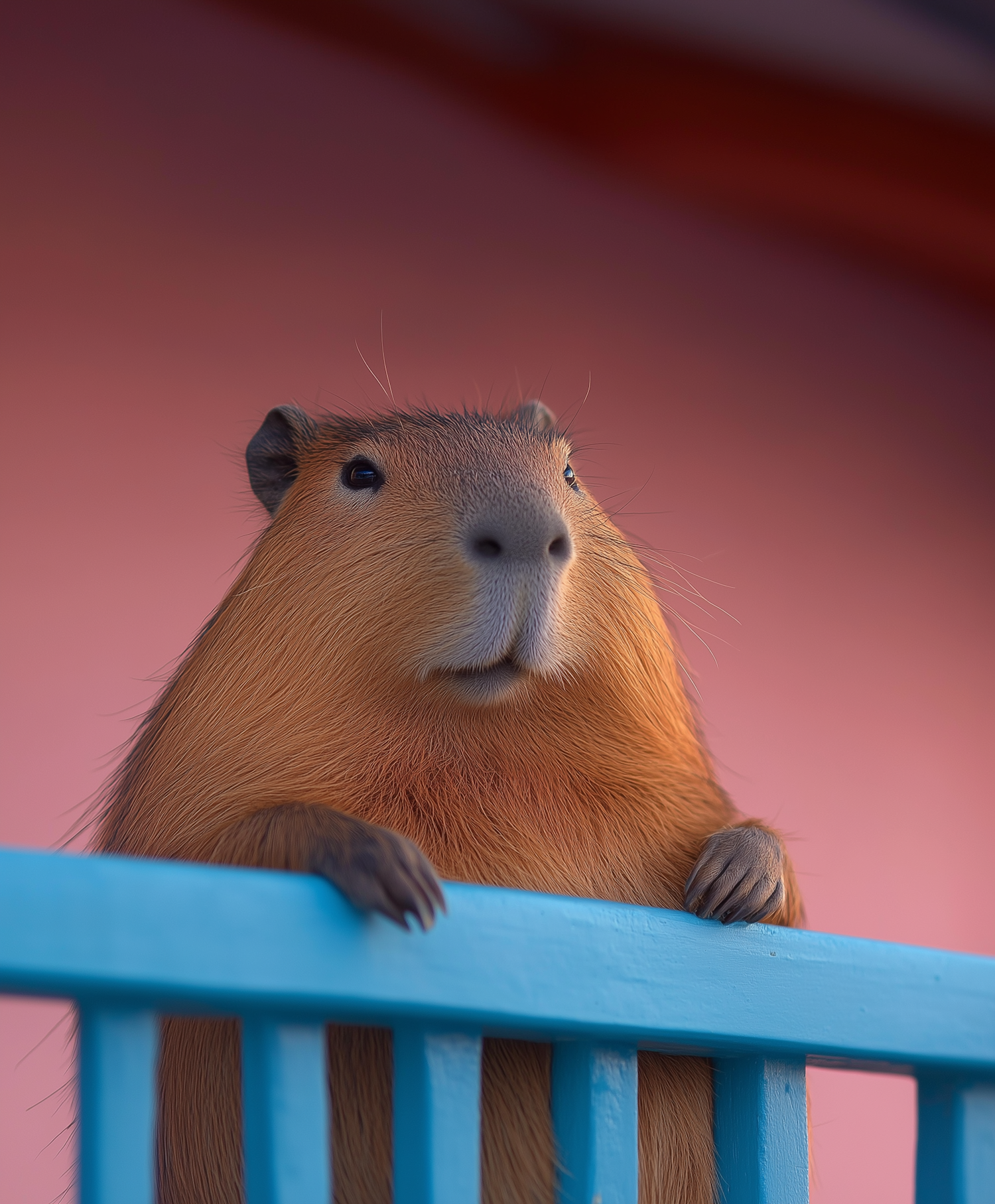 A curious capybara leans on a bright blue fence against a soft pink background, creating a vibrant and serene scene.