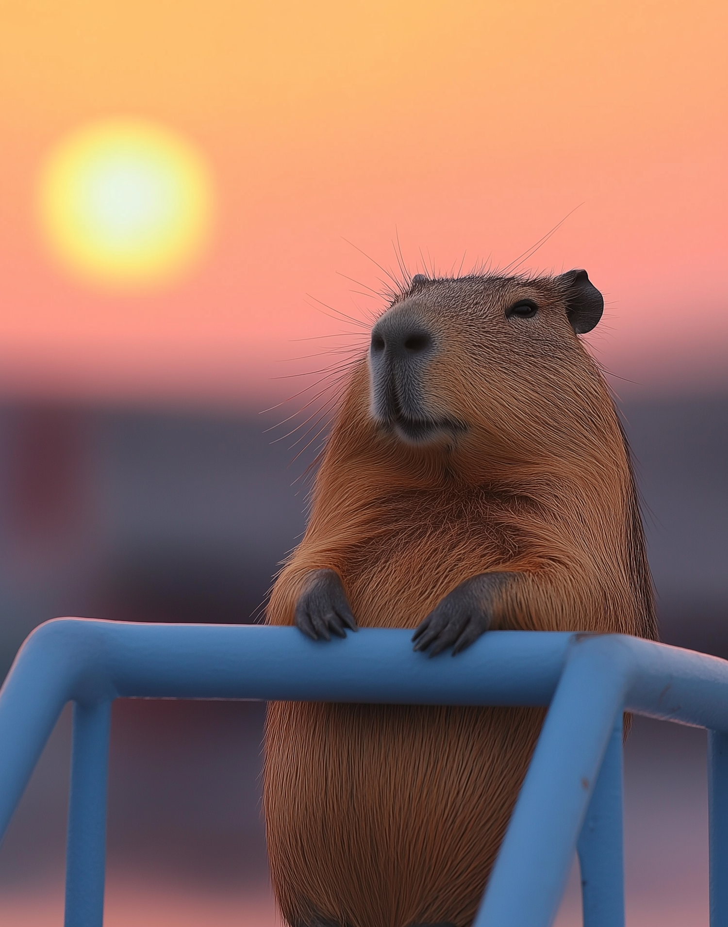 A serene capybara rests on a blue railing against a vibrant sunset, showcasing warm tones and a peaceful atmosphere.