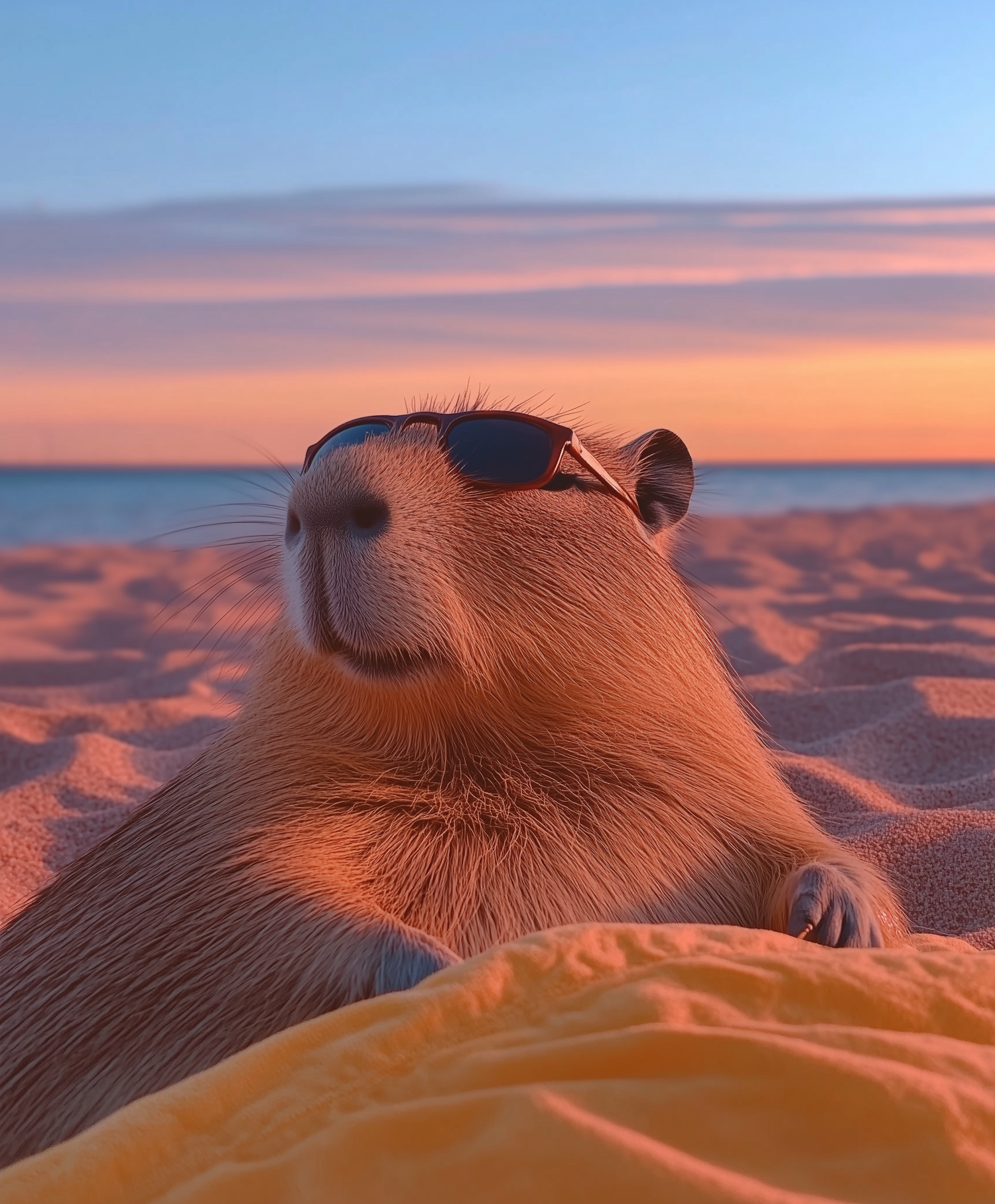 A cool capybara wearing sunglasses relaxes on a beach at sunset, with a yellow blanket and serene ocean in the background.
