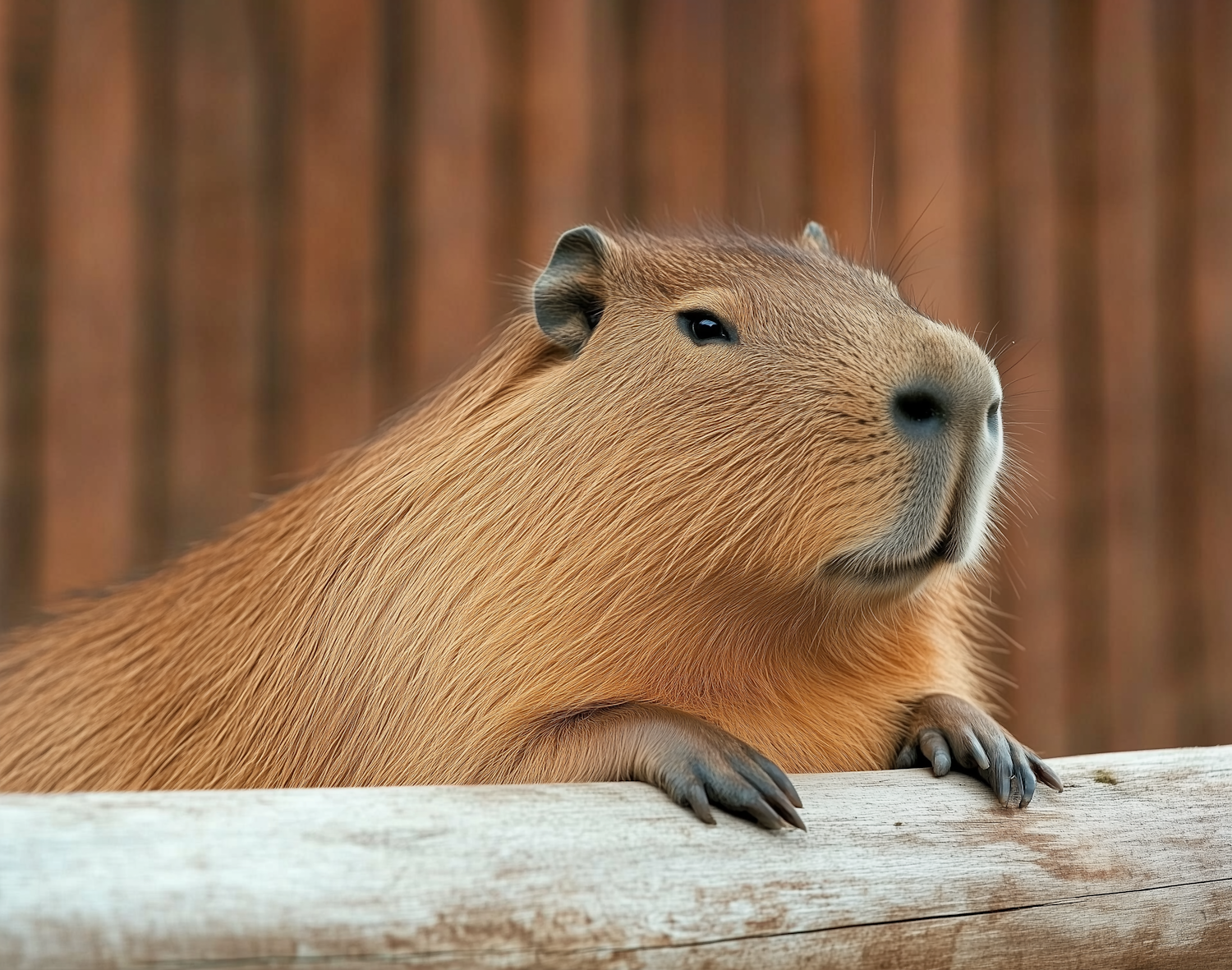 Adorable capybara resting its paws on a wooden log, showcasing its golden-brown fur and calm expression against a warm, blurred background.