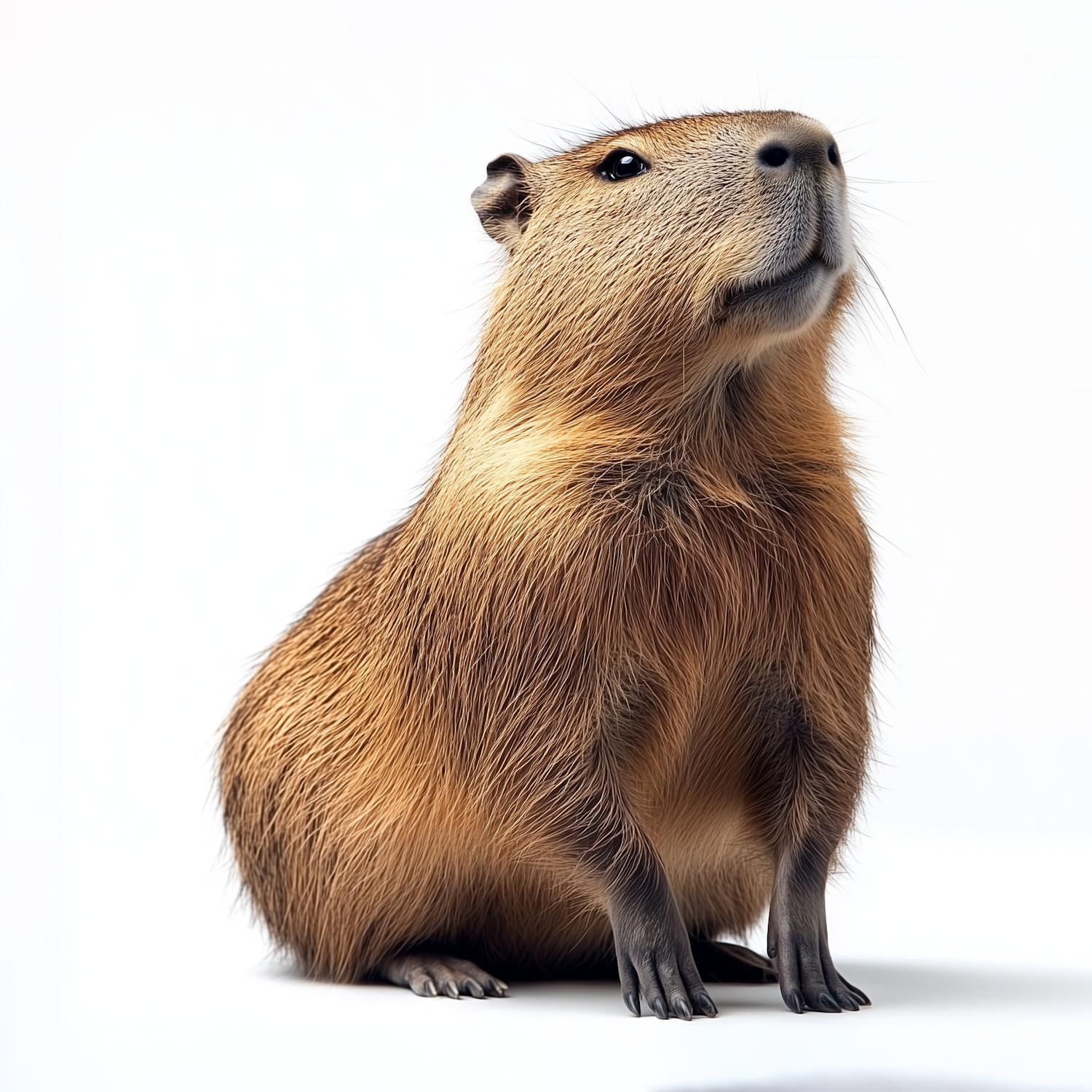 Adorable capybara sitting upright with golden-brown fur and curious expression, set against a clean white background.