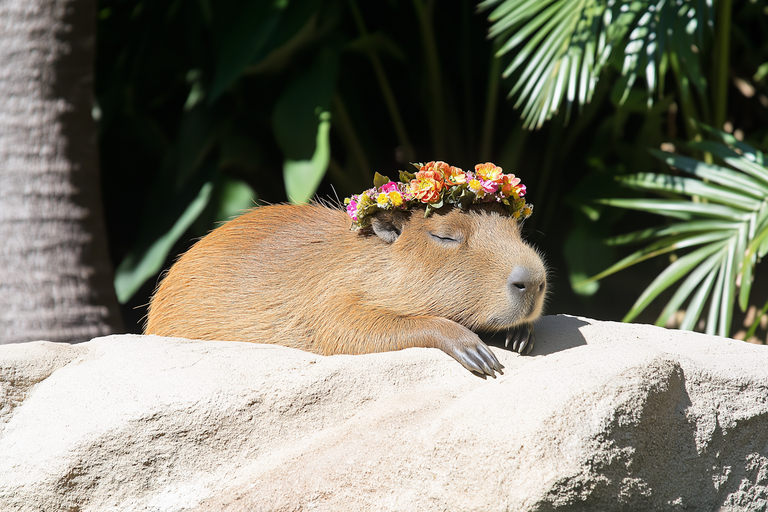 A relaxed capybara wearing a colorful flower crown rests on a rock, surrounded by lush greenery and bathed in sunlight.