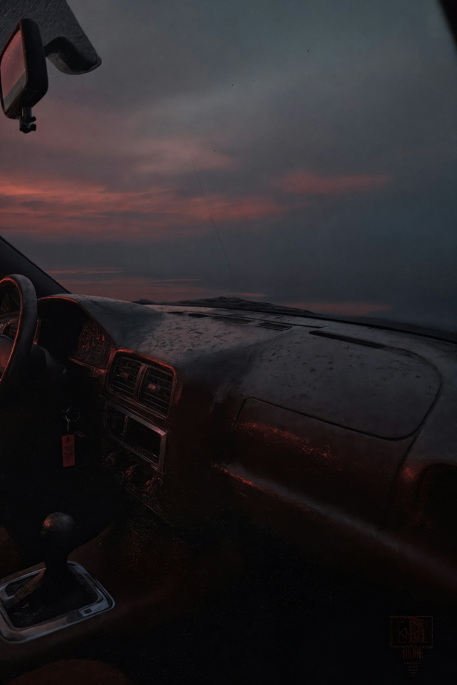 A car interior with a dusty dashboard and sunset hues glowing through the windshield, creating a serene and nostalgic ambiance.