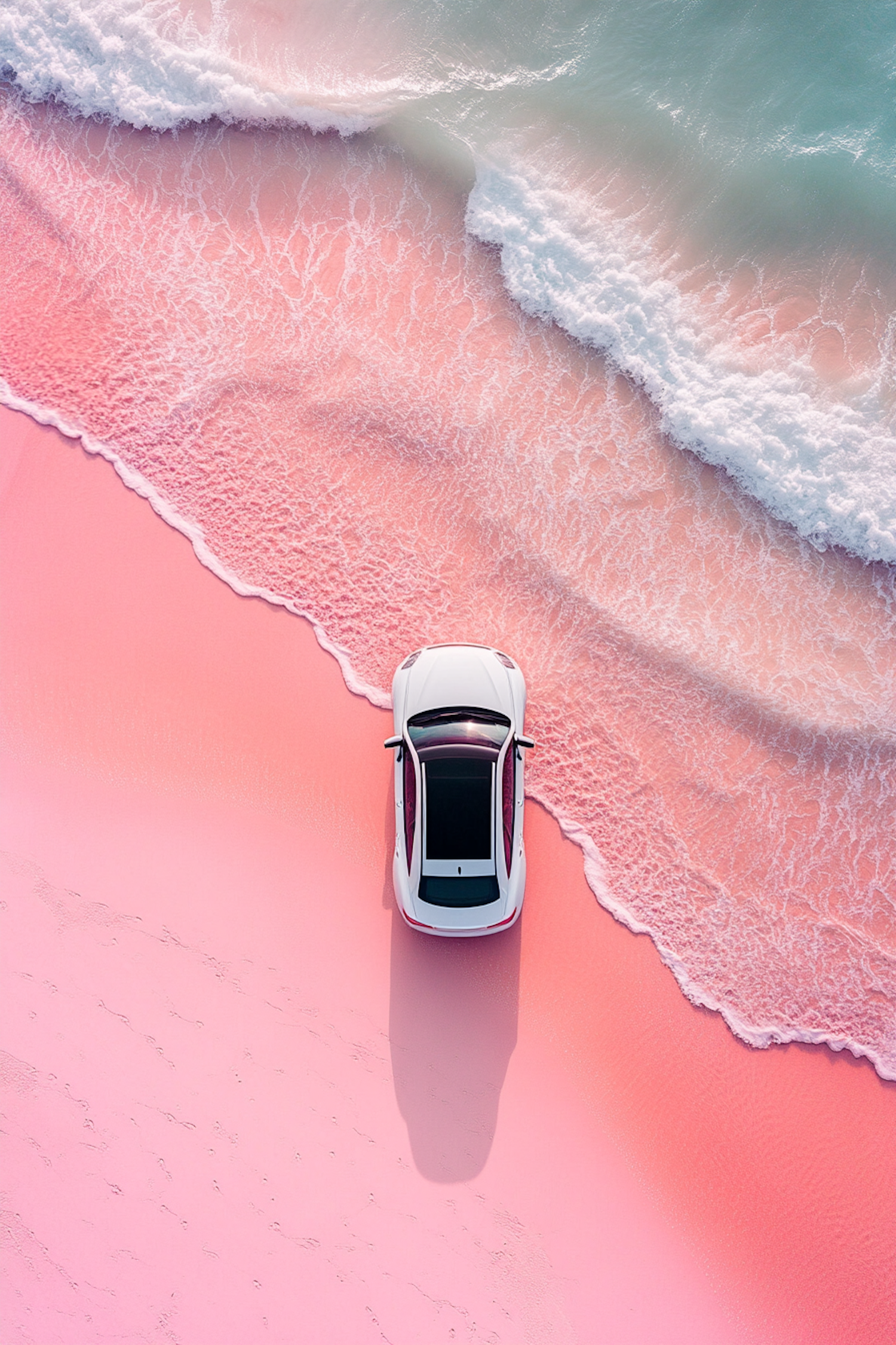 A white car on a pink beach with turquoise waves, creating a surreal and tranquil scene from an aerial view.