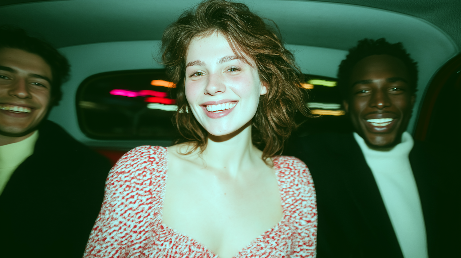 Three friends smiling and enjoying a car ride at night, with blurred city lights in the background.