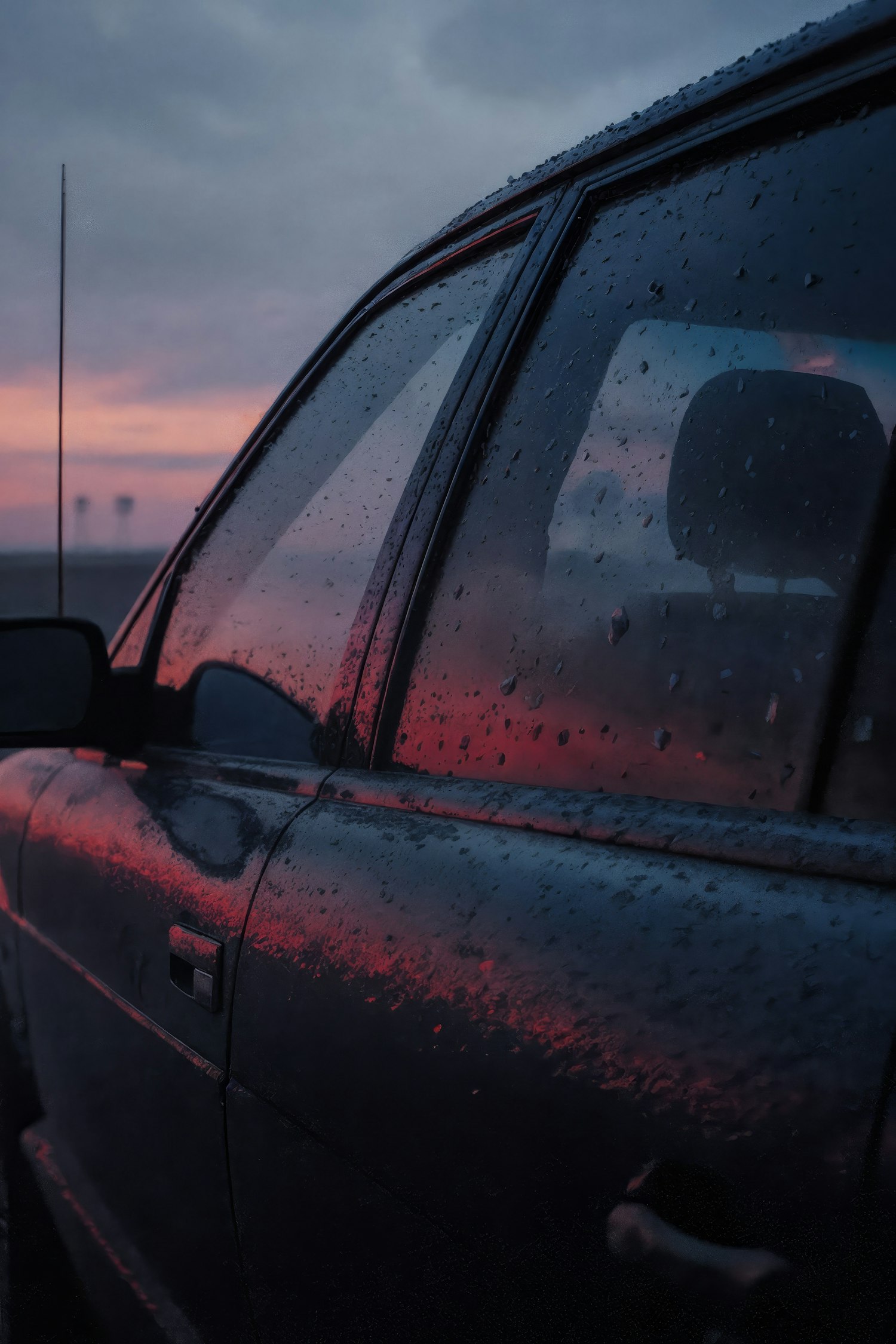 Close-up of a car's wet surface reflecting a vibrant sunset, with raindrops and a moody sky creating a serene and dramatic scene.