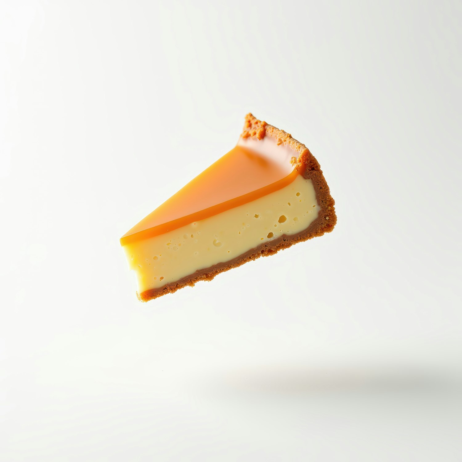 Floating slice of caramel-topped cheesecake with a golden crust against a white background, highlighting its creamy texture and glossy caramel.