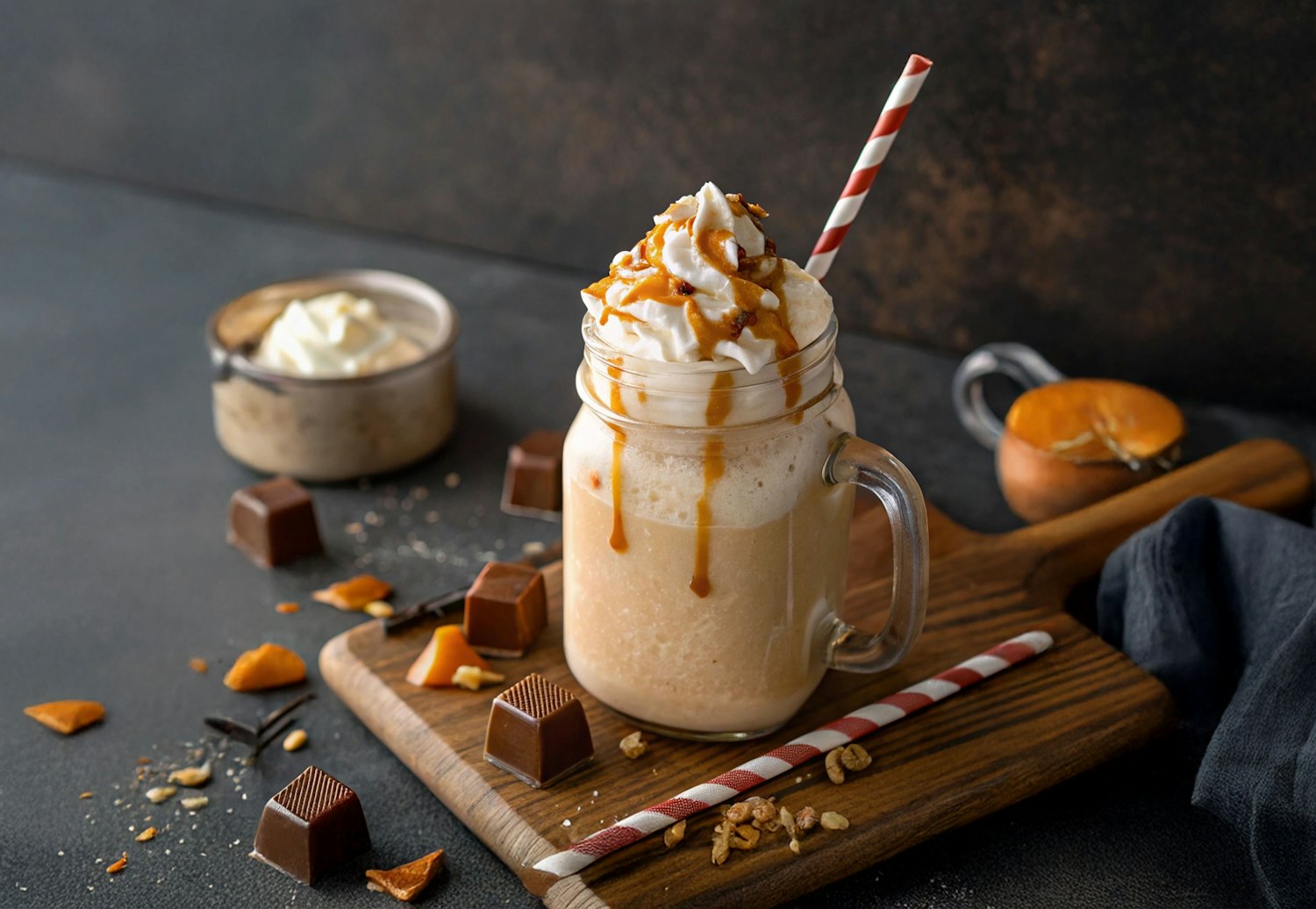 Delicious caramel milkshake topped with whipped cream and caramel drizzle, served in a mason jar with chocolate and caramel accents.