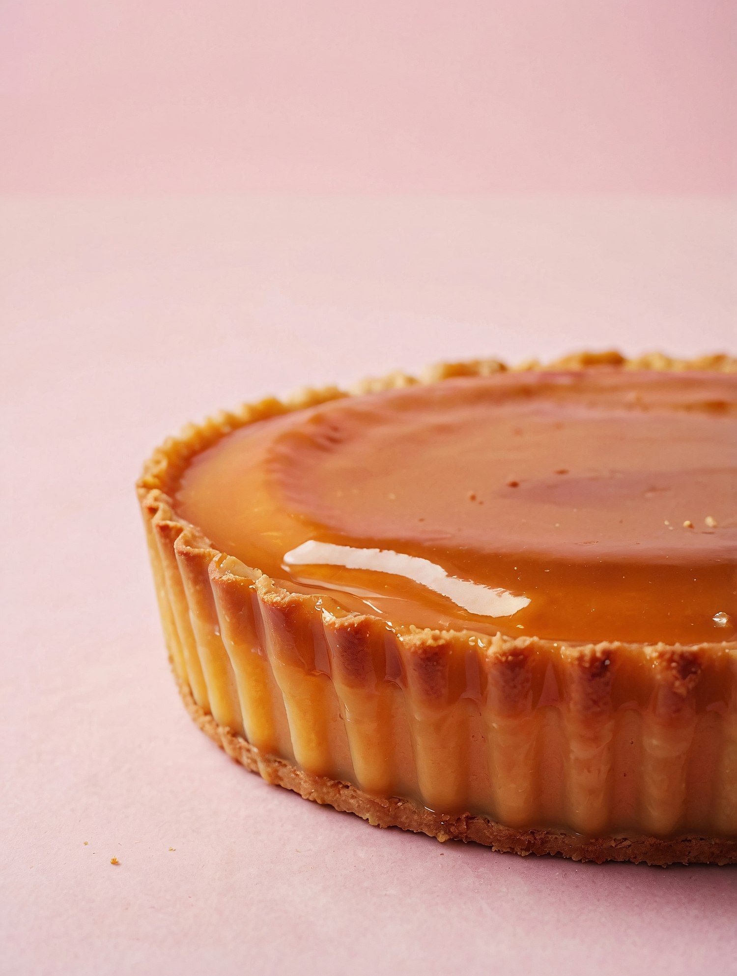 Close-up of a glossy caramel tart with a golden crust on a soft pink background. Perfect for dessert lovers and food photography enthusiasts.