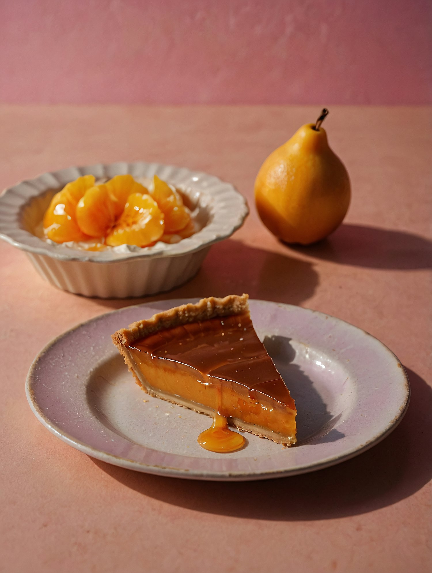 A slice of caramel tart with dripping sauce, a bowl of orange fruit slices, and a golden pear on a soft pink background.