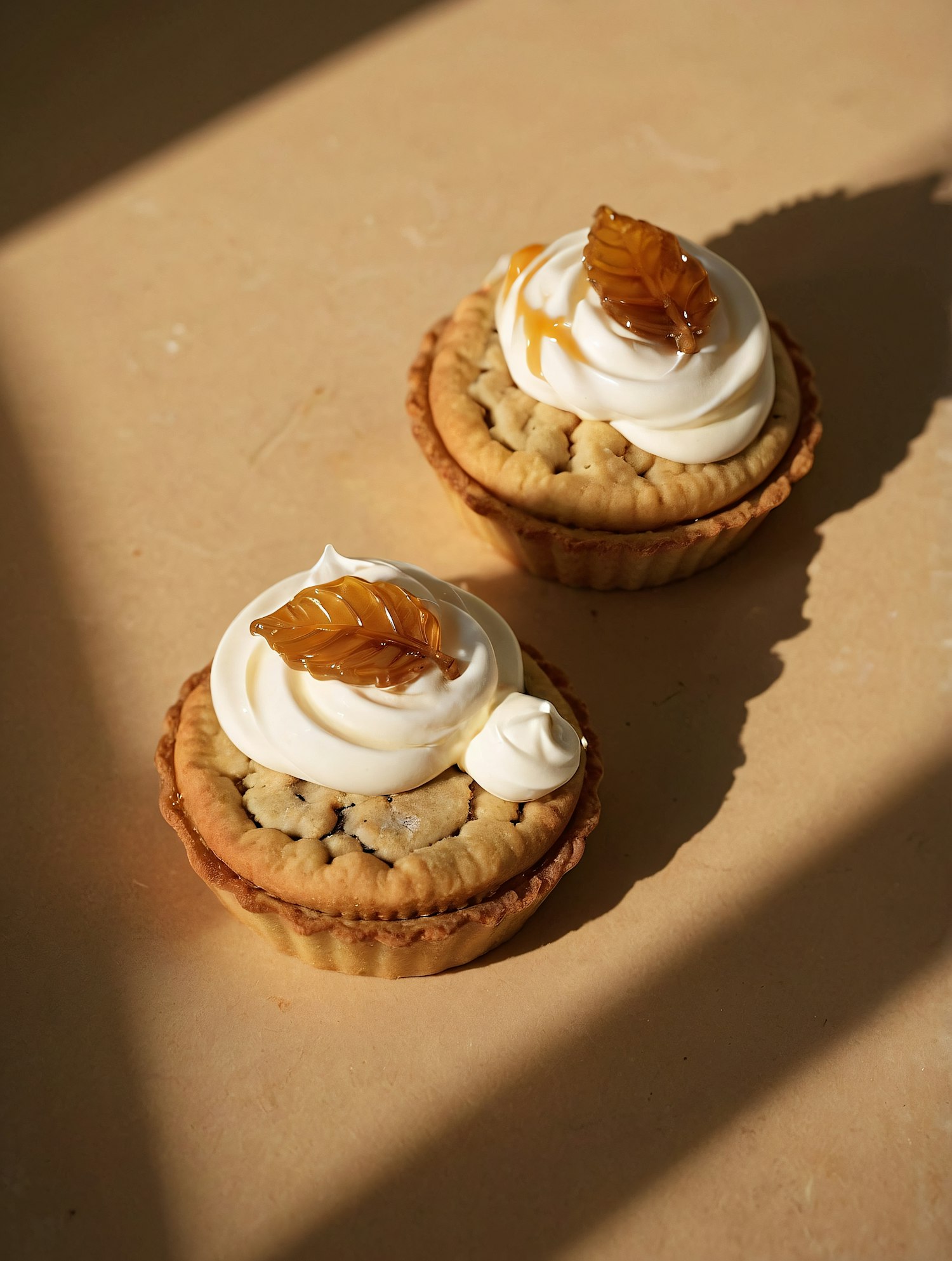 Two golden tarts topped with whipped cream, caramel drizzle, and sugar leaves, bathed in warm natural light on a beige surface.