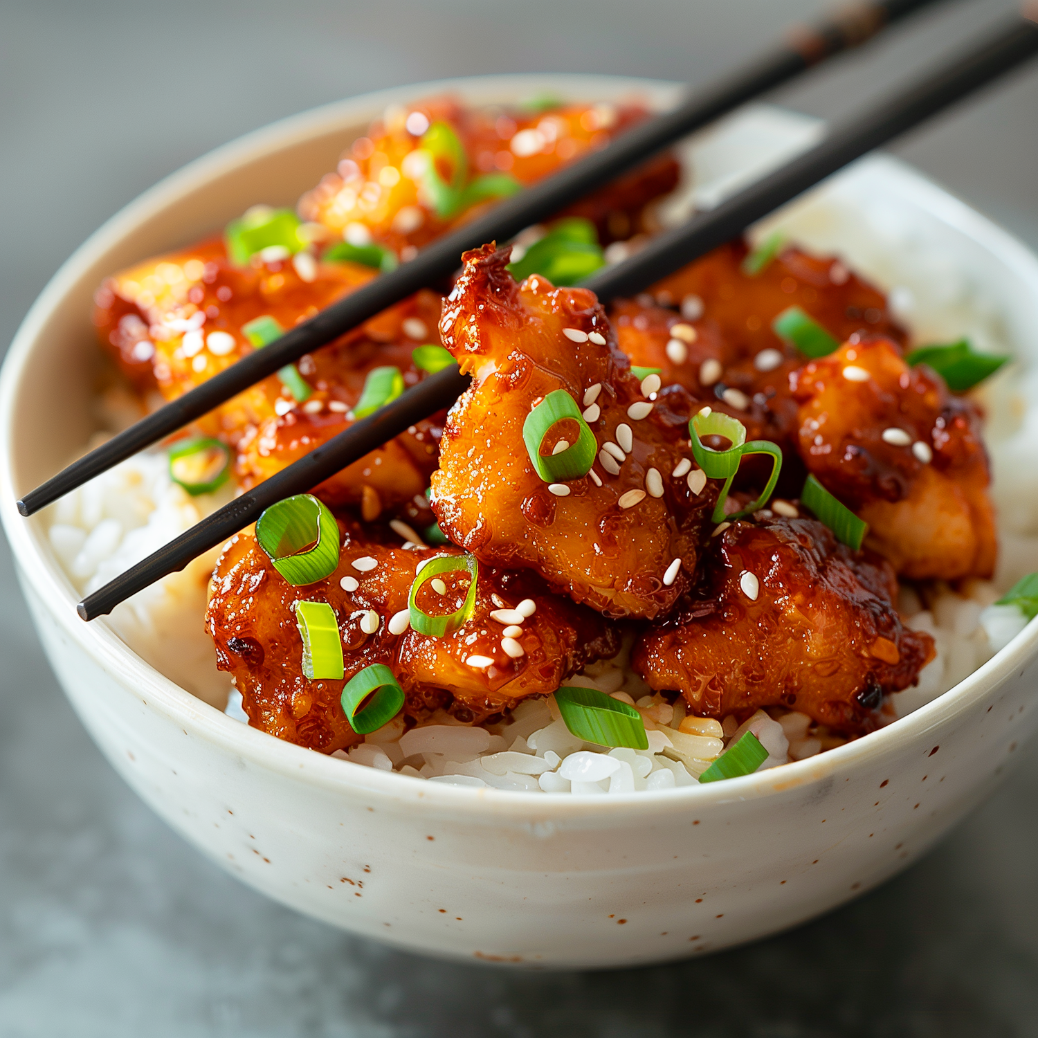 Crispy glazed chicken with sesame seeds and scallions over rice, served with chopsticks in a bowl. Perfect for an Asian-inspired meal.