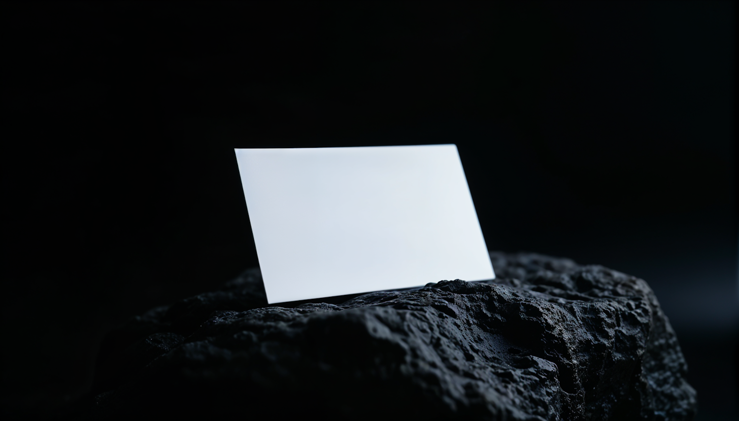 Minimalist white card on dark textured rock with dramatic lighting and deep black background.