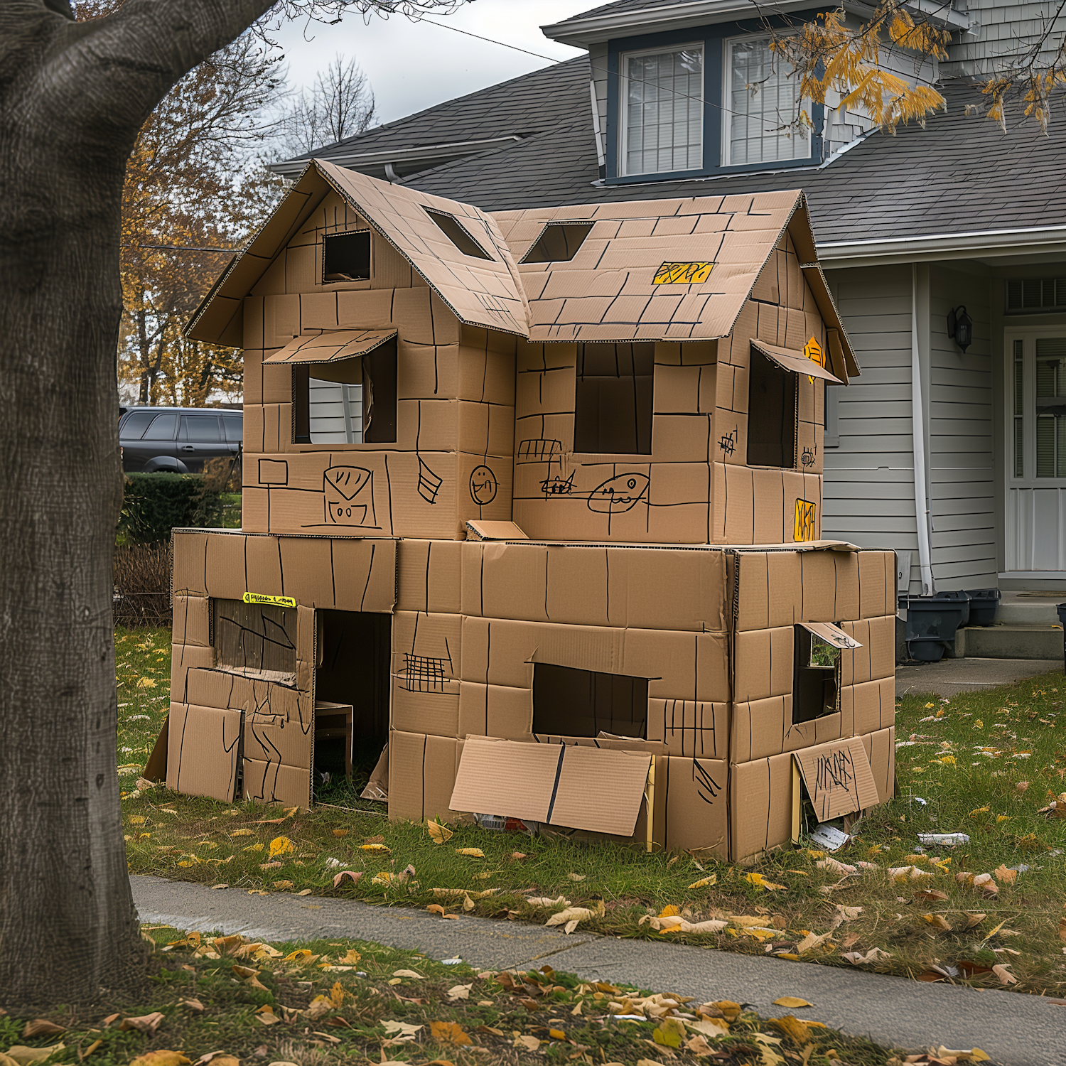 A creative two-story cardboard playhouse with hand-drawn designs stands on a lawn, surrounded by autumn leaves.