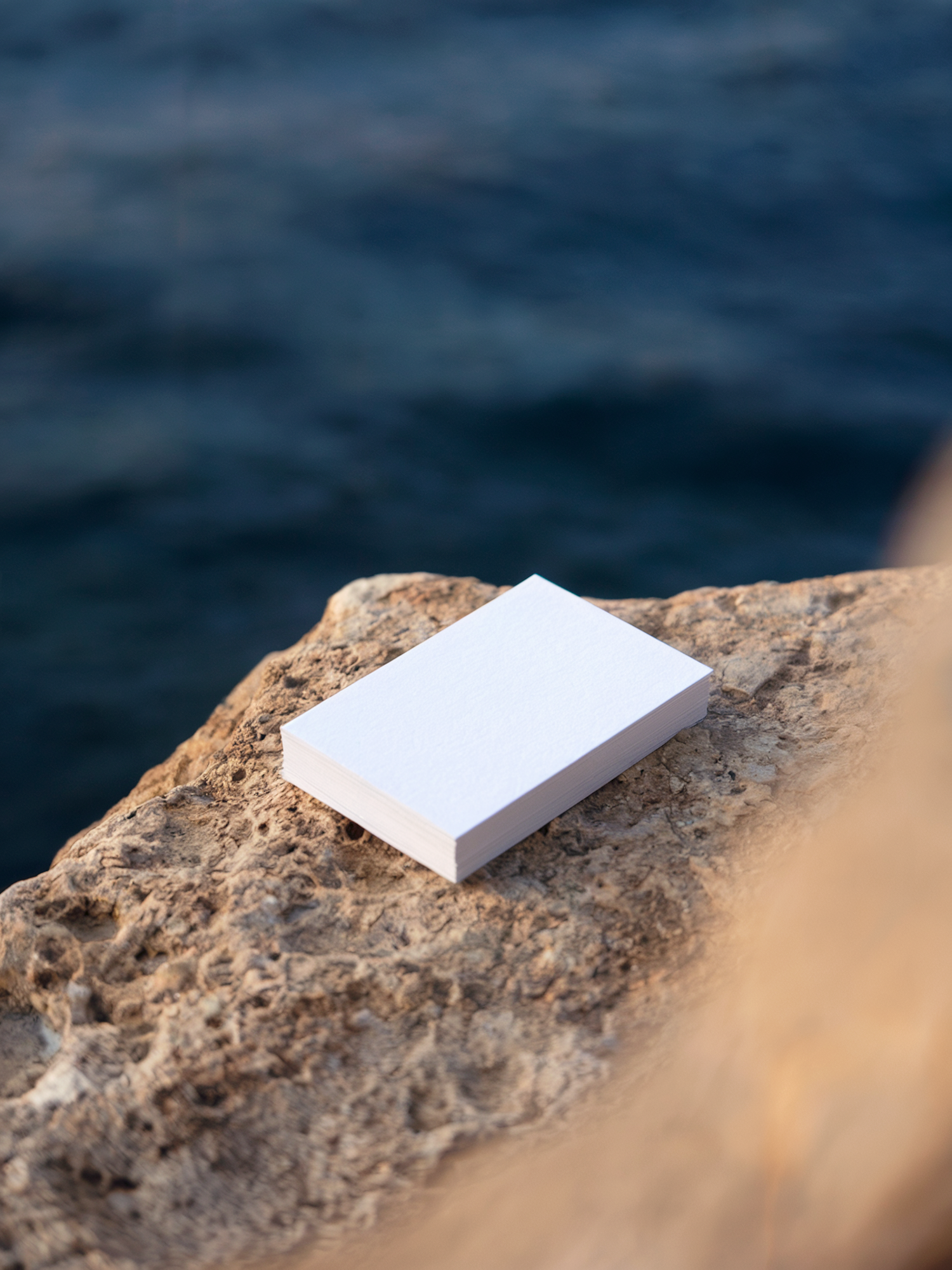 Stack of blank white cards on a textured rock by the sea, with a blurred blue water background.