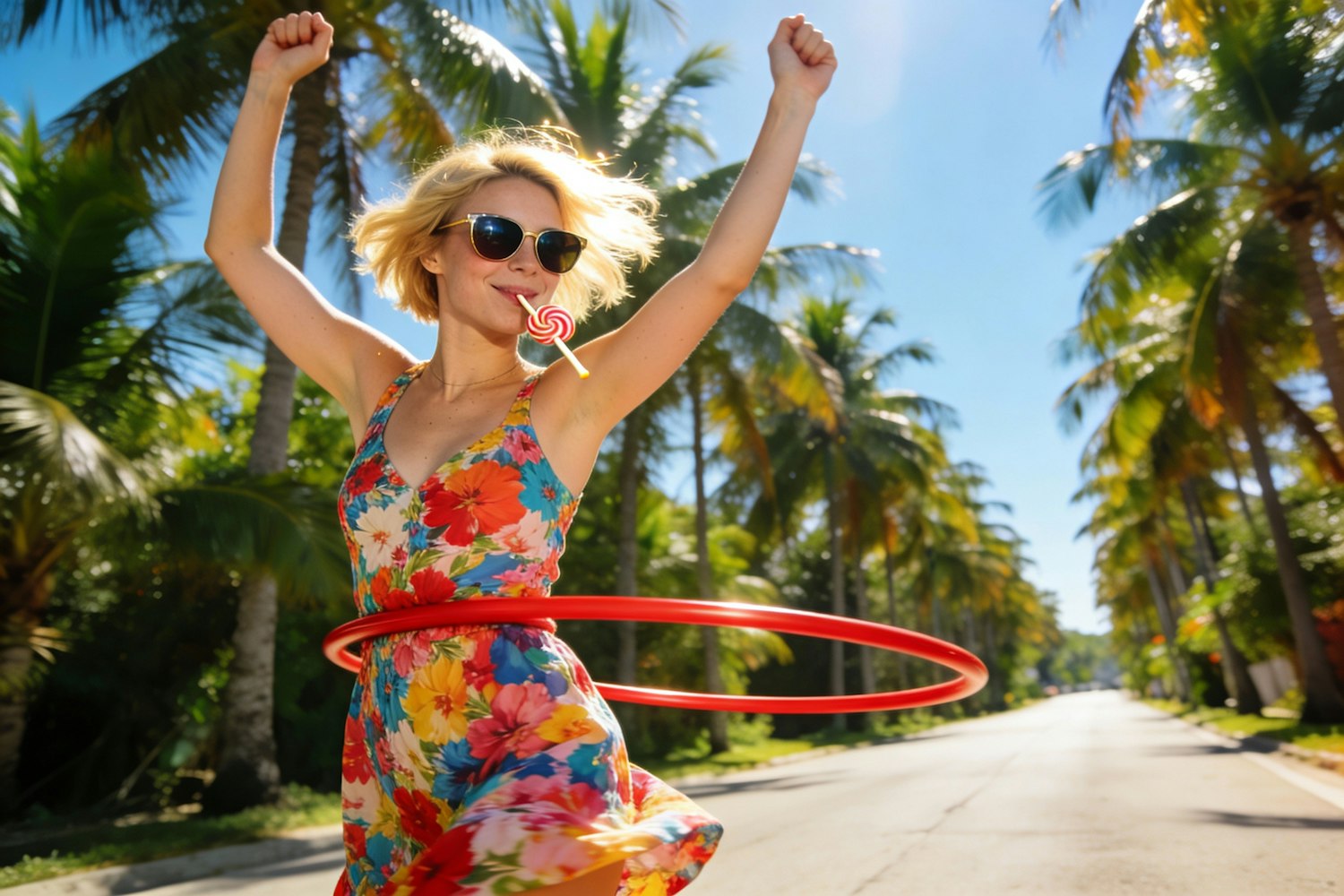 An super ultra-realistic photo of an energetic woman joyfully playing with a red hula hoop in the middle of a palm-lined street. She wears a colorful floral dress and stylish sunglasses, raising both arms in excitement. And a thin smile is sucking on a lollipop stick inside his mouth. creating a natural and playful expression as she spins the hoop, The red hula hoop circles her waist in mid-motion. Bright midday sunlight highlights her face, short blonde hair, and the vibrant colors of her dress. with tropical palm trees and clear blue sky in the background. The overall atmosphere is lively, sunny, and highly photorealistic.