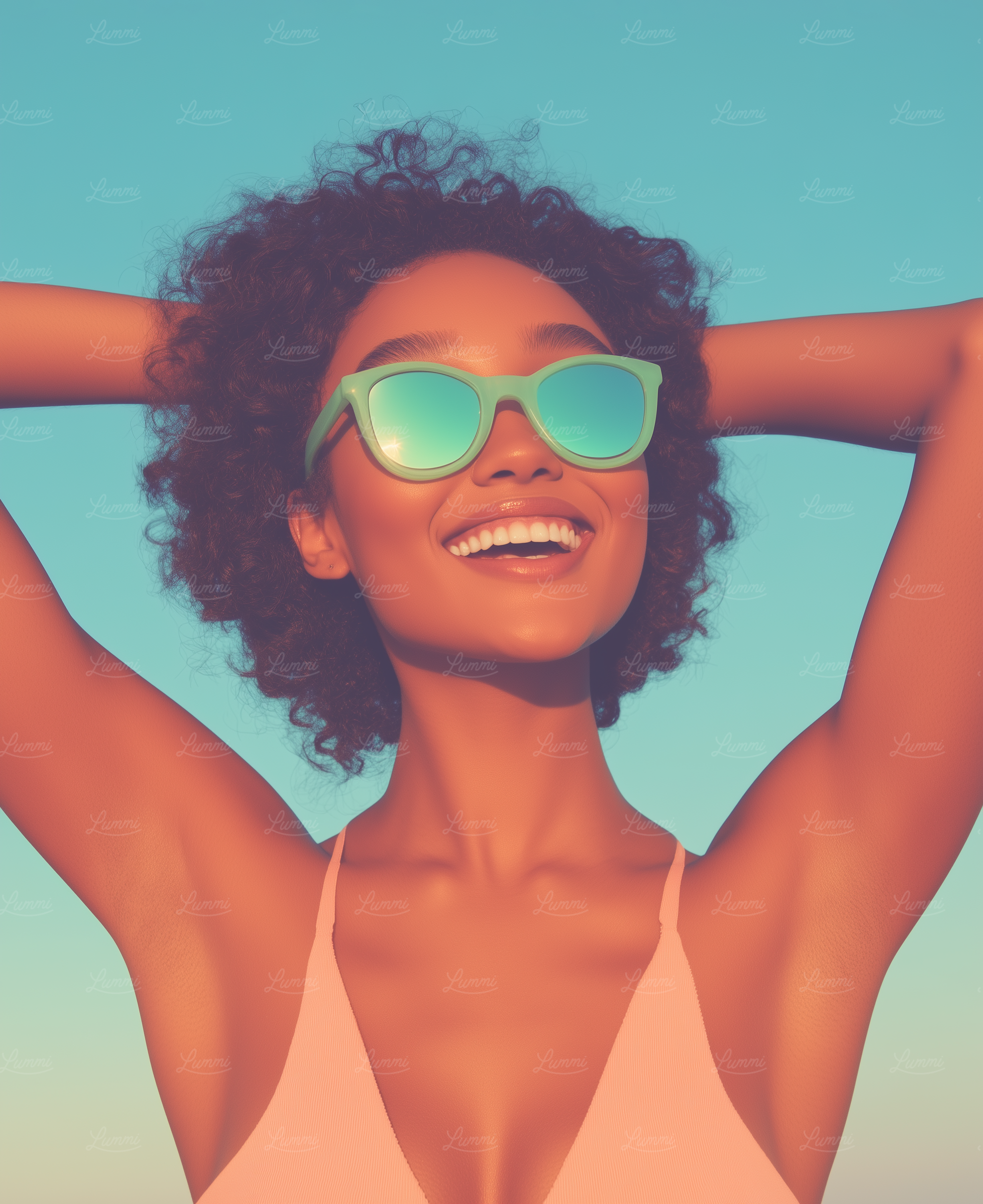 A cheerful woman in green sunglasses and a pink top enjoys a sunny day, her arms raised against a vibrant blue sky.