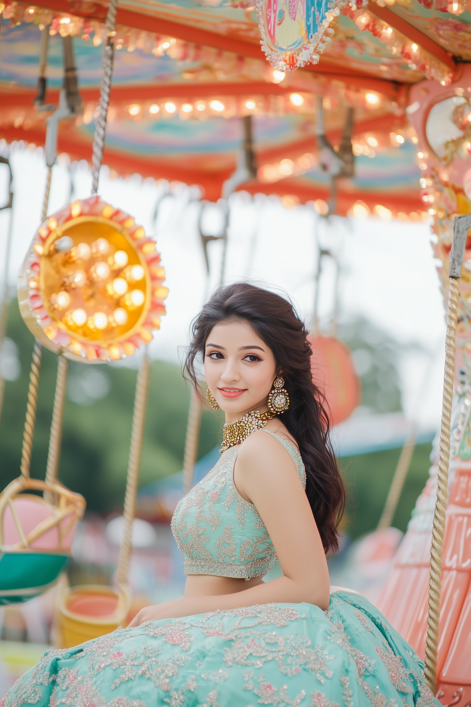 Young woman in a traditional blue dress on a carousel, adorned with ornate jewelry, exuding elegance and joy in a festive setting.