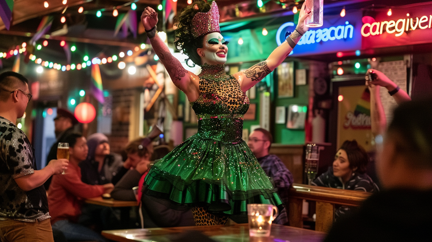 Drag performer in a vibrant bar, wearing a sparkling green dress, entertains a diverse crowd under colorful lights and pride flags.