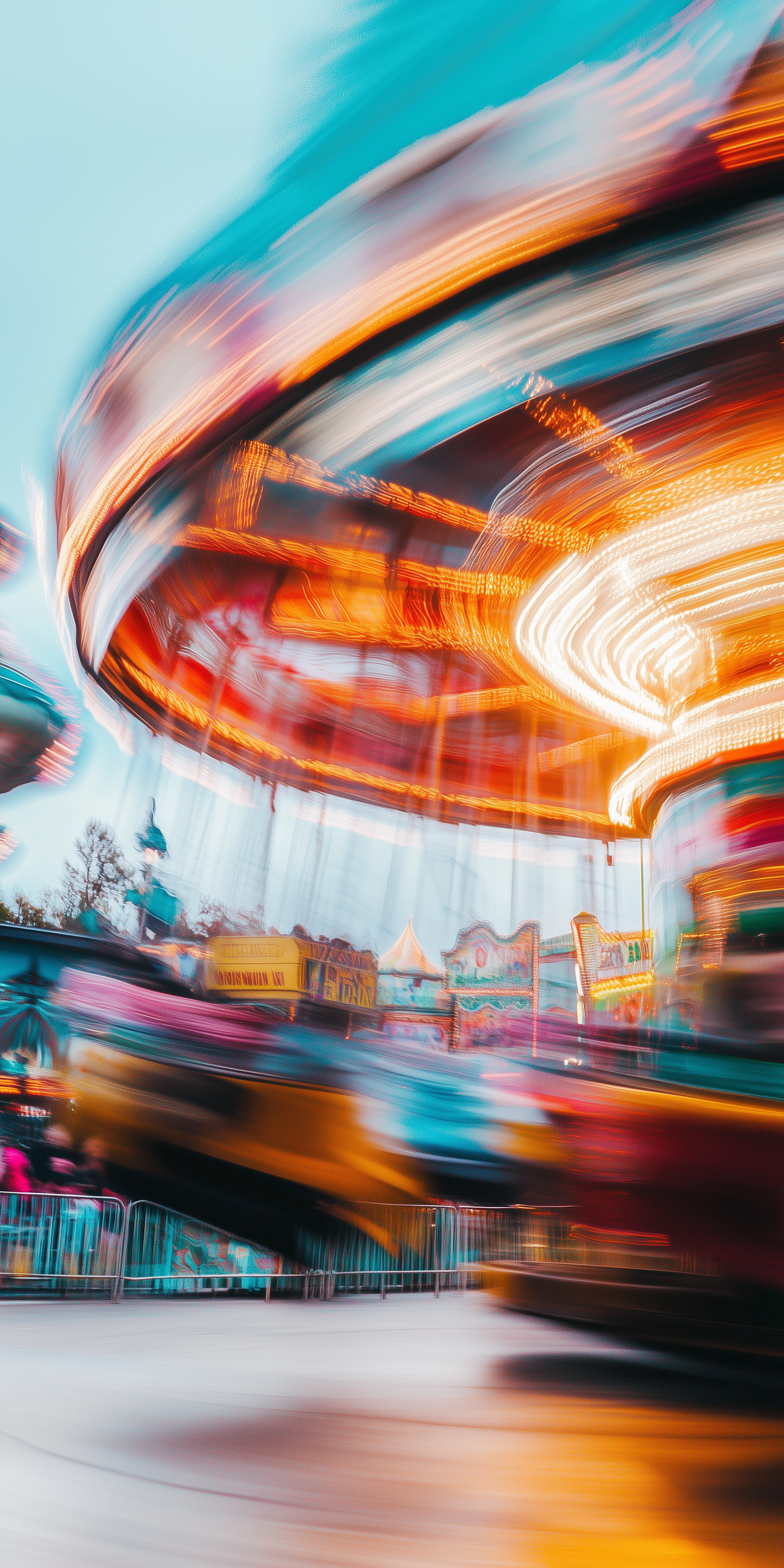 Dynamic motion blur of a spinning carousel with vibrant lights and colors at an amusement park.