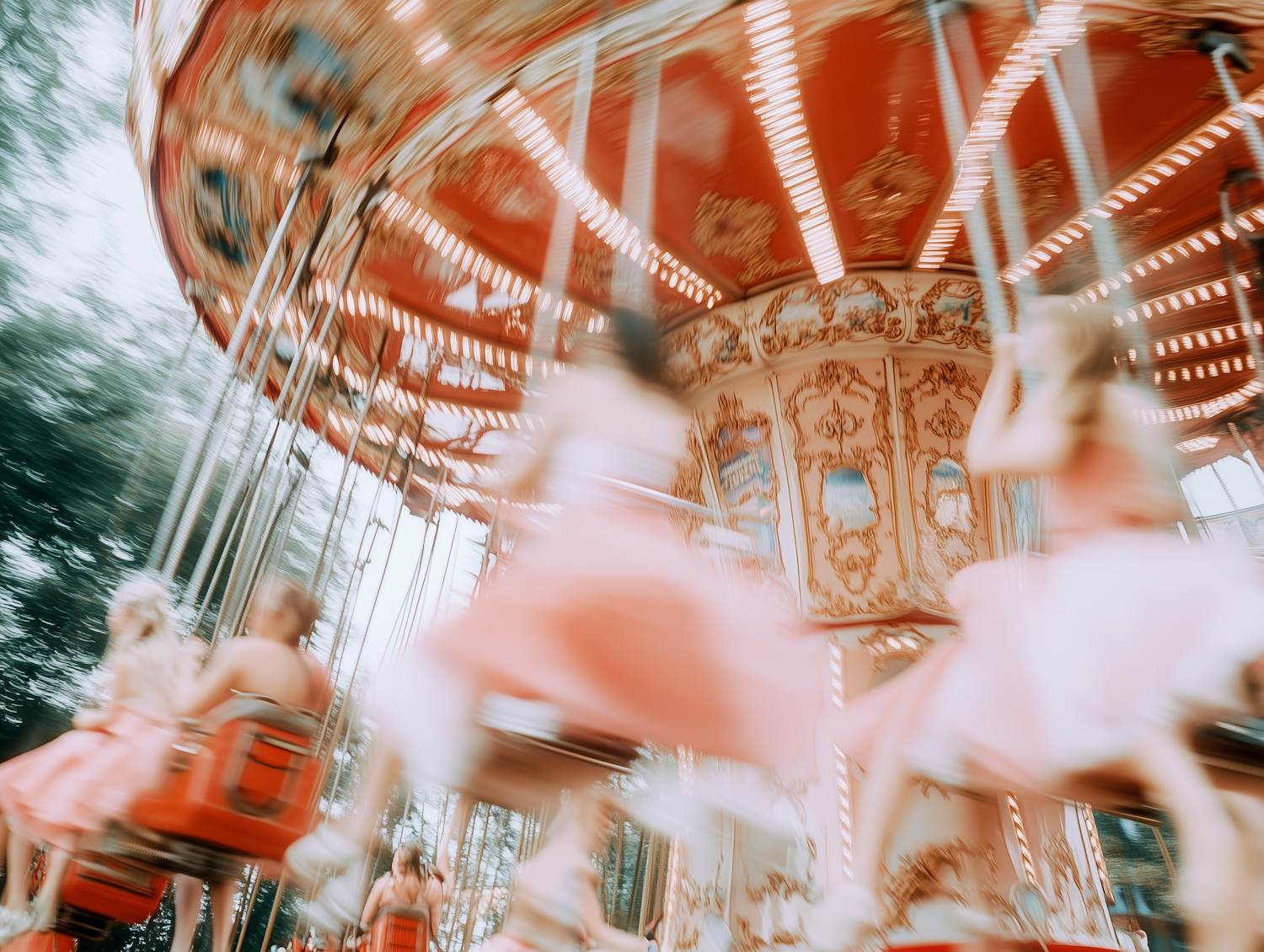 Blurred carousel in motion with children on swings, ornate red and gold design, glowing lights, and a lively fairground vibe.