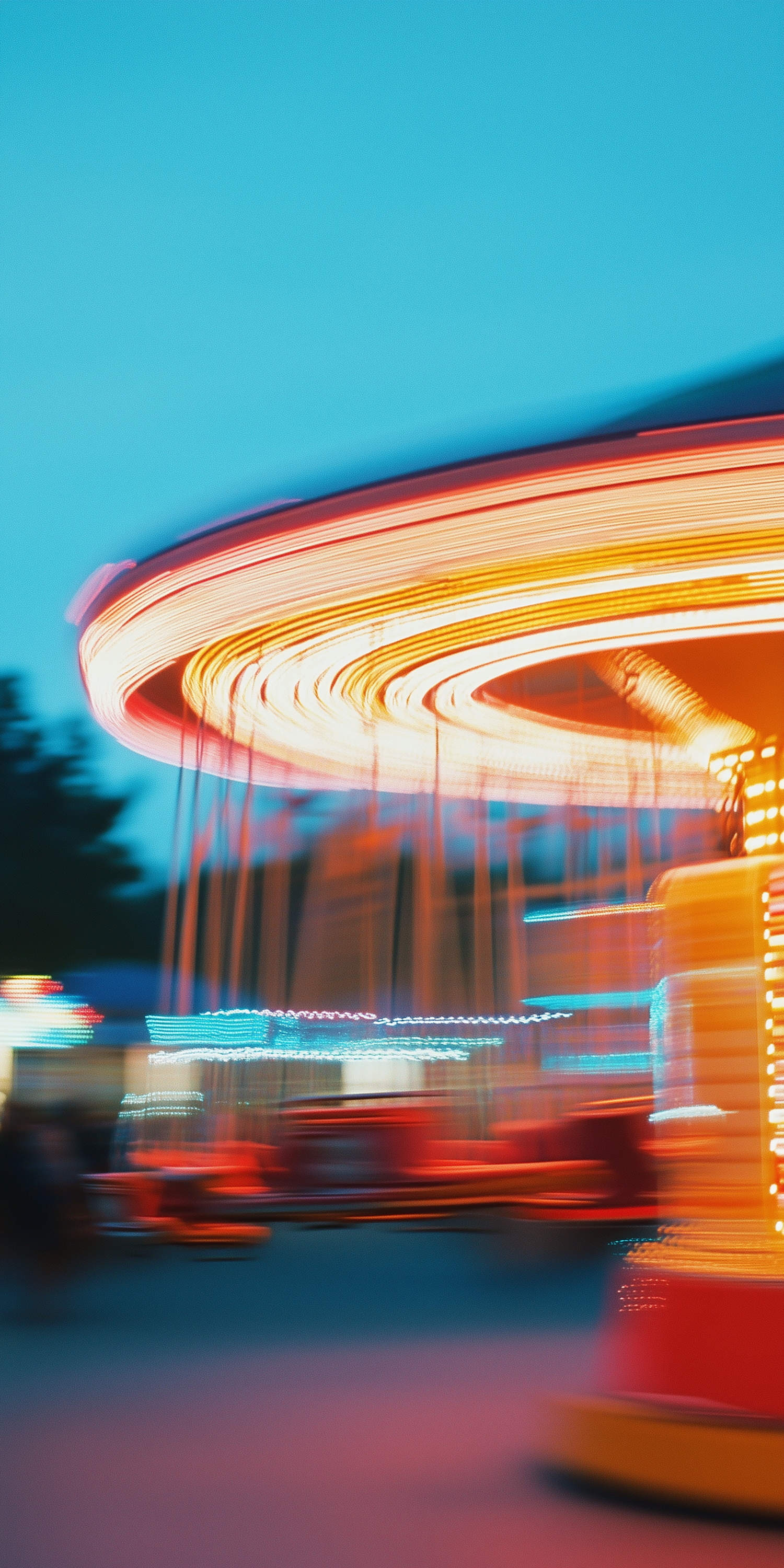 Blurred carousel lights create a dynamic, colorful scene against a clear blue sky, capturing the excitement of an amusement park.